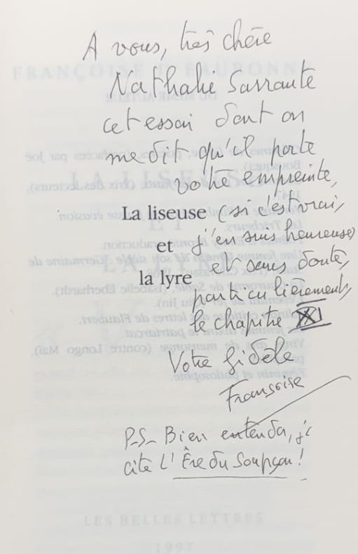 Paris Les Belles Lettres, coll. "Réinventer l'amour" 1997 1 vol. broché in-8, broché, couverture illustrée, 192 pp. Édition originale de cet essai interrogeant l'implication de la littérature sur la condition humaine et notamment celle des femmes. Bel envoi autographe signé de l'autrice : "A vous, très chère Nathalie Sarraute cet essai dont on me dit qu'il porte votre empreinte, (si c'est vrai, j'en suis heureuse) et sans doute, particulièrement, le chapitre XI / votre fidèle Françoise / P.S. Bien entendu, je cite L'Ère du soupçon !"