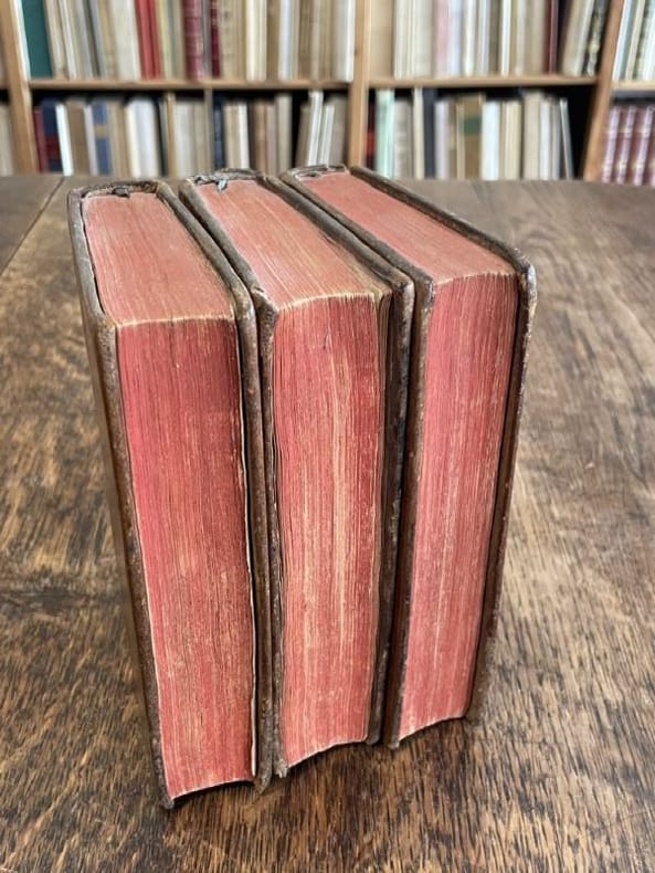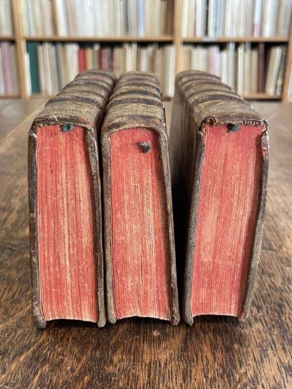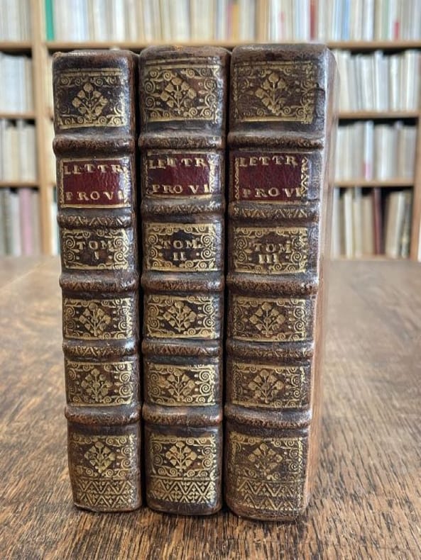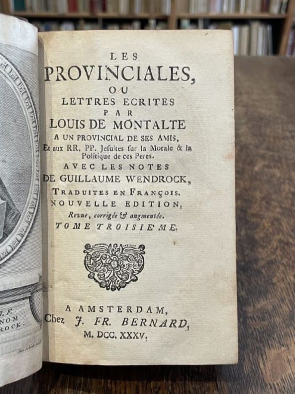 Sans lieu sans nom 1712 3 vol. relié 3 vol. in-12, reliés plein veau moucheté havane, dos à nerfs ornés de fleurons et motifs dorés, pièces de titre et de tomaison havane, tranches rouges (reliure de l'époque), (14) + 360 + (16), (10) + 362 + (14) et (10) + 332 + (12) pp., portrait de Pascal au frontispice du tome 2 (coiffes émoussées, mors supérieur du tome 3 un peu fragile). Manquent le frontispice du tome 1 et le portrait de Nicole du tome 3. Nouvelle édition revue, corrigée et augmentée, avec les notes de Guillaume Wendrock (Pierre Nicole) traduites en français par Mlle de Joncoux, avec la collaboration de Jean Louail. Bon exemplaire malgré le manque des deux gravures.