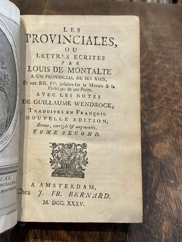 Louis de Montalte, pseudonyme de Blaise Pascal, prit dans cet ouvrage la défense d'Antoine Arnauld & bien sûr du jansénisme en lutte à cette époque contre les jésuites. La lutte se solda par la condamnation d'Antoine Arnauld pour hérésie, l'interdiction de Port-Royal & l'exil de nombreux membres. Toutefois, cette défaite n'entama pas la forte influence qu'exerça Port-Royal en France & en Europe ............... RARE EDITION .... en trés bon état (very good condition). bon