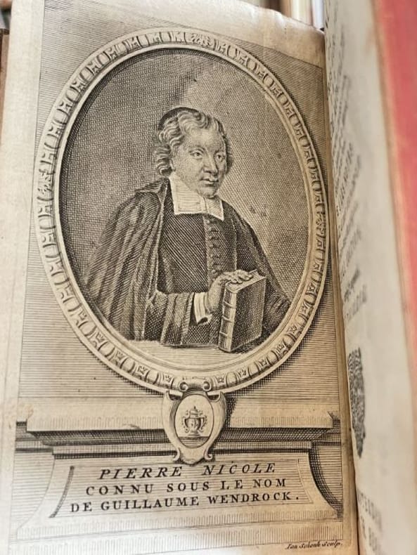 Amsterdam J. Fr. Bernard 1735 3 vol. relié 3 vol. in-12, reliés plein veau moucheté havane, dos à nerfs ornés de fleurons et motifs dorés, pièces de titre de maroquin rouge, tranches rouges (reliure de l'époque), 7 ff. + 404 pp., 5 ff. + 378 pp. et 4 ff. 372 pp., 3 frontispices gravés. Nouvelle édition revue, corrigée et augmentée, avec les notes de Guillaume Wendrock (Pierre Nicole) traduites en français par Mlle de Joncoux, avec la collaboration de Jean Louail. Bel exemplaire en reliure de l'époque, bien complet des gravures.