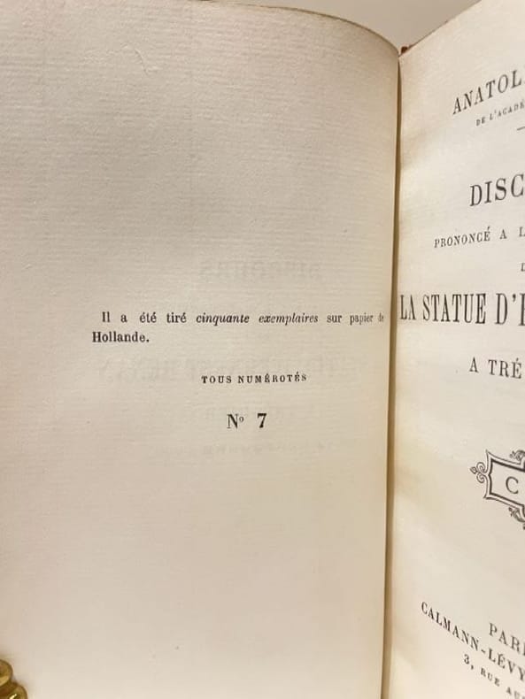 Paris Calmann-Lévy, éditeur 1903 in 8 (20x14,5) 1 volume broché, couverture illustrée rempliée, 44 pages, non rogné. Discours prononcé à l'inauguration de la statue de Ernest Renan à Tréguier, le 13 septembre 1903. Edition originale, celui-ci un des 50 exemplaires numérotés sur papier de Hollande, seul grand papier. Bel exemplaire ( Photographies sur demande / We can send pictures of this book on simple request )