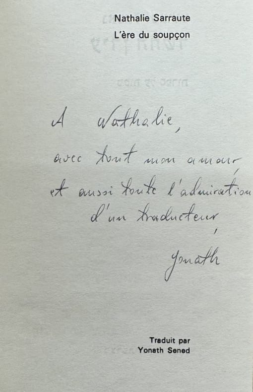 [Yonath Sened, traducteur] 1971 1 vol. broché in-12, cartonnage illustré de l'éditeur, 153 pp. Édition en hébreu enrichie d'un envoi autographe signé du traducteur à Nathalie Sarraute.