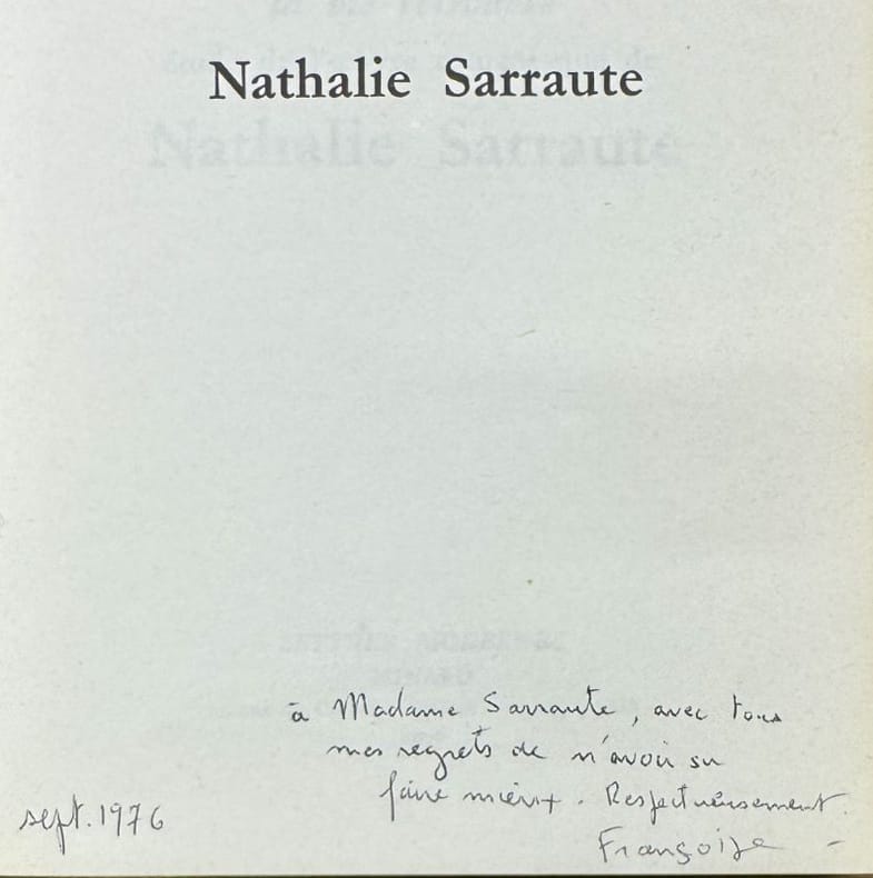 Paris Minard, coll. "Lettres modernes" 1976 1 vol. Broché in-8, broché, 247 pp. Edition originale avec un envoi de l'autrice "à Madame Sarraute, avec tous mes regrets de n'avoir su faire mieux. Respectueusement. Françoise, sept. 1976". Dos un peu ridé.
