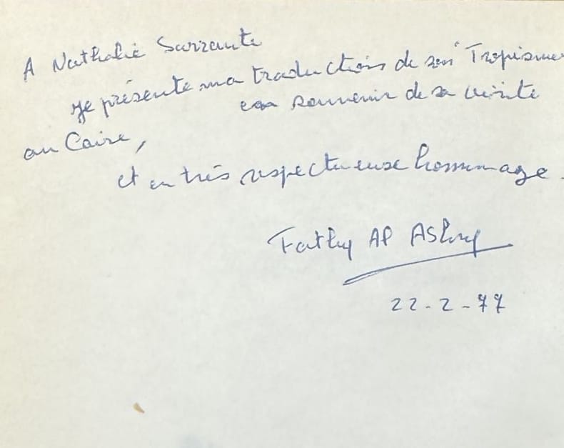 Paris [Fathy Al Ashry, traducteur] 1971 1 vol. broché in-12, broché, couverture illustrée. Édition en langue arabe enrichie d'un envoi autographe signé du traducteur à Nathalie Sarraute. Joint : un billet tapuscrit dans lequel la femme de lettres remercie pour cette traduction.