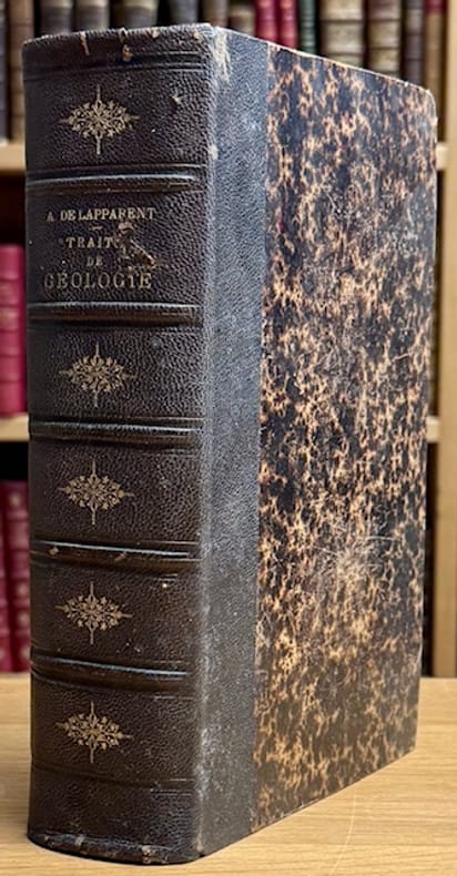 Paris, F. Savy, 1883, in-8, 2 vol, XV-[1]-1280 pages en numérotation continue, Demi-chagrin bleu sombre, dos à nerfs et fileté, monogramme G.R. doré en pied des dos [G. Ramond], Première édition, peu courante. Nombreuses figures gravées sur bois dans le texte. Exemplaire abondamment annoté au crayon. Ce célèbre traité de géologie est considéré comme l'un des mieux organisés et des plus clairs de son époque ; il brosse sans doute le tableau le plus complet de l'ensemble des connaissances acquises à la fin du XIXe siècle sur les phénomènes géologiques. Albert de Lapparent (1839-1908), élève de l'École Polytechnique et des Mines, était professeur de géologie et minéralogie à l'Institut catholique de Paris au moment de sa fondation (1875). Il fut également directeur de recherches au CNRS, créateur de la mission géologique française en Afghanistan et conservateur-adjoint des collections départementales de l'École des Mines (1868). Il travailla pendant plusieurs années à la Carte géologique détaillée de la France. Il fut l'un des principaux rédacteurs de la Revue de géologie (1866-1880), publia d'intéressants articles dans le Correspondant, les Annales des mines, et fit de savantes communications à la Société de géologie, dont il fut nommé président en 1880, ainsi qu'à l'Académie des sciences de Paris. Il obtint de cette dernière le prix Laplace en 1861 et le prix Delesse en 1885. Il est également l'auteur d'un Cours de minéralogie (Paris, 1884) largement diffusé. Étiquettes ex-libris de la bibliothèque G. Ramond aux contreplats ; probablement Georges Ramond, proche parent des Jussieu, aide-naturaliste à la chaire de géologie au Muséum de 1892 à 1923. Ramond est sans doute l'auteur des nombreuses annotations qui enrichissent cet exemplaire. Couverture rigide