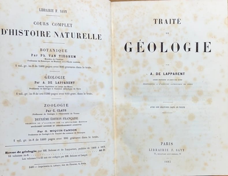 avec des figures dans le texte. Tome I. Figure et dimension de la Terre - Températures terrestre - Delta marin, dépôts d'estuaires - Formation des glaciers - Actions chimiques de l'eau des mers et des grands lacs - Récifs coralliens - Gaz - Sources thermales - Causes du volcanisme - Théories thermodynamiques - Geysers, calcaires - Glaces hivernales - Mouvements de l'écorce, etc... vol relié in4, 25x16, demi cuir, frottements, bon état intérieur, 567pp. Paris, F. Savy, 1893 Le "Traité de Géologie" est un ouvrage majeur dans le domaine de la géologie écrit par Albert de Lapparent, également connu sous le nom d'Albert-Auguste Cochon de Lapparent. C'est un géologue français qui a joué un rôle important dans le développement de la géologie en France au XIXe siècle. Le "Traité de Géologie" a été publié pour la première fois en 1869 et a été révisé et réédité plusieurs fois par la suite. Cet ouvrage est considéré comme l'un des traités de référence en géologie et a eu une influence significative sur le développement de la discipline. Le livre couvre de nombreux aspects de la géologie, y compris la formation de la Terre, les roches, les minéraux, la tectonique des plaques, les volcans, les séismes, les fossiles, la géologie économique et bien d'autres sujets. Il présente les principes et les concepts fondamentaux de la géologie de manière claire et détaillée, en s'appuyant sur les connaissances et les découvertes de l'époque. Albert de Lapparent a également joué un rôle actif dans l'organisation de la recherche géologique en France. Il a été le fondateur et le directeur de l'École des Mines de Paris et a contribué à la création du Service géologique de France. Le "Traité de Géologie" d'Albert de Lapparent a été largement utilisé comme référence dans l'enseignement de la géologie et a aidé à établir les bases de la discipline en France et dans le monde entier. ref/151