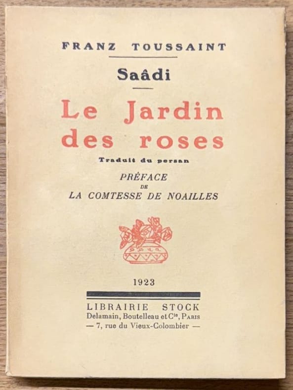"Il est superflu de rappeler ici l'importance du Jardin des roses et celle du Jardin des fruits, son pendant, chefs-d'oeuvre du grand poète de Chiraz. Franz Toussaint les a rendus célèbres en France par sa traduction à "la phrase nette et lisse" dont madame de Noailles dit "qu'elle tend un pur miroir aux rêveries du poète oriental". Voir le sommaire sur photos jointes.