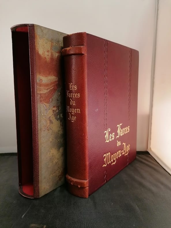 Exemplaire sur vélin chiffon des Papeteries Navarre imprimé pour M. Henri Bourde. Ce volume contient : Maître Pierre Patelin - La Farce du cuvier - Le Vilain mire - Le Sauteur de Notre-Dame. Très bon état d’occasion