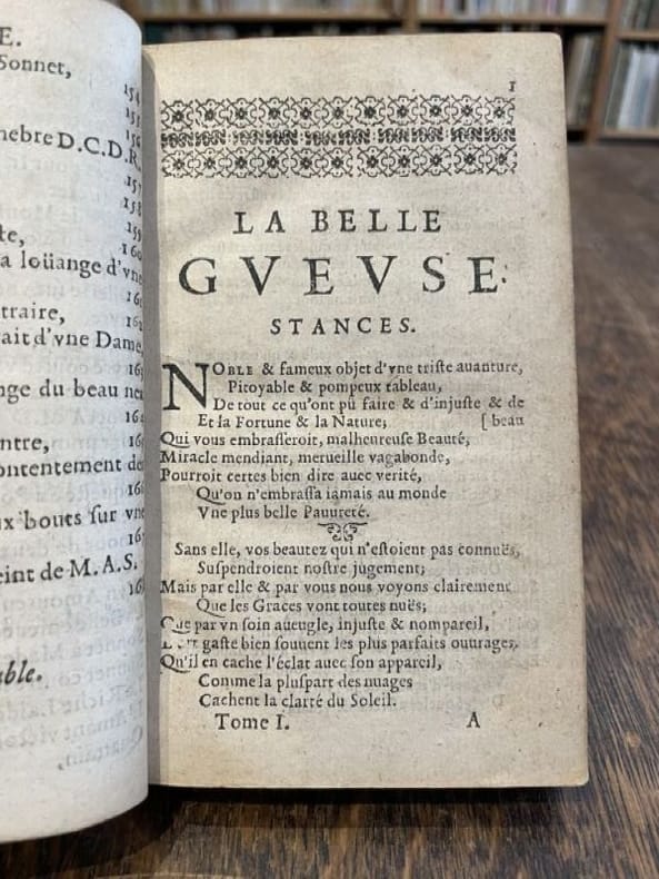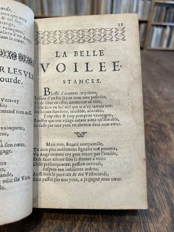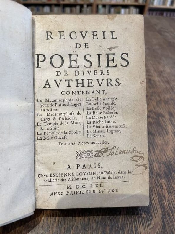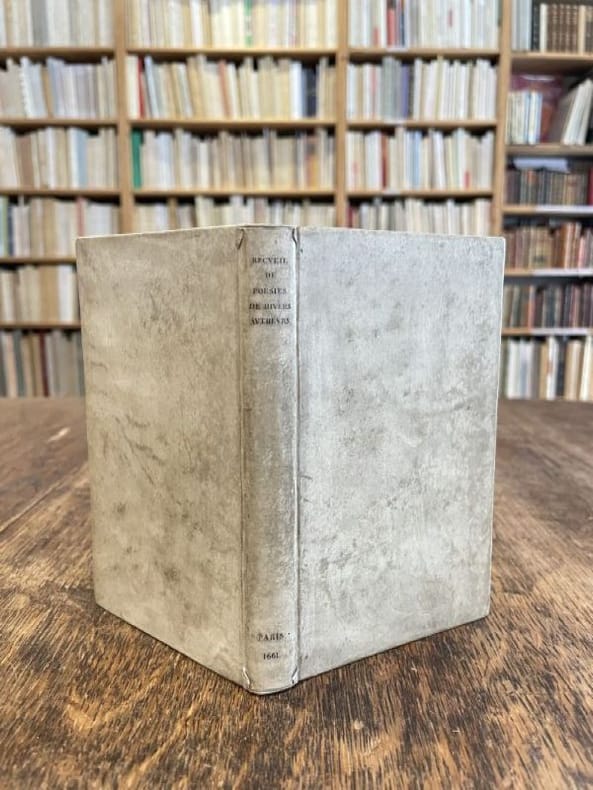 Paris chez Estienne Loyson 1661 1 vol. relié 2 tomes reliés en 1 vol. in-12, plein vélin ivoire moderne, (12) + 165 + (3) + 168 pp. Nouvelle édition sous un nouveau titre du recueil de Chamboudry publié en 1657 : Tristan L'Hermite, Scarron, Paul Sarrasin, Jean-François Sanguin-Pavin, Denis Montreuil, Mathieu de Ménage, etc. Ex-libris gravé : Ad. Van Bever.