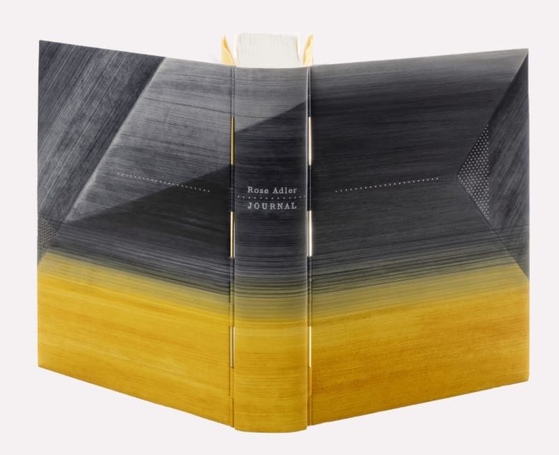 Paris Éditions des cendres, coll. "Inédits de la Bibliothèque Jacques Doucet" 2014 1 vol. Relié in-8, reliure doublée à tiges : plein veau aniline, décor peint de figures géométriques en nuances de gris et d'un large bandeau jaune d'or en pied. Plats finement perforés de lignes et formes triangulaires. Doublures bords à bords en cuir gris griffé de fines lignes noires, tiges de titane dorés et gardes volantes en papier vietnamien teint en jaune. Titrage au film gris sur le dos. Chemise rigide décorée, titrée sur le dos, étui. Titrages de Geneviève Quarré de Boiry, couvertures conservées (Julie Auzillon, 2023), XLI + 490 pp., photos en noir. Édition originale de ce journal que Rose Adler (1890-1959) commence à rédiger sous l'impulsion de son mécène Jacques Doucet, dans le prolongement de leurs échanges esthétiques. Loin d'être intimiste, avec un index de plus de mille entrées, c'est un précieux document sur l'art de la reliure, à la croisée des milieux artistique et littéraire. Un des 15 exemplaires de luxe justifiés à la main in fine (ex. X/XV), recouvert d'une superbe reliure de création de Julie Auzillon.