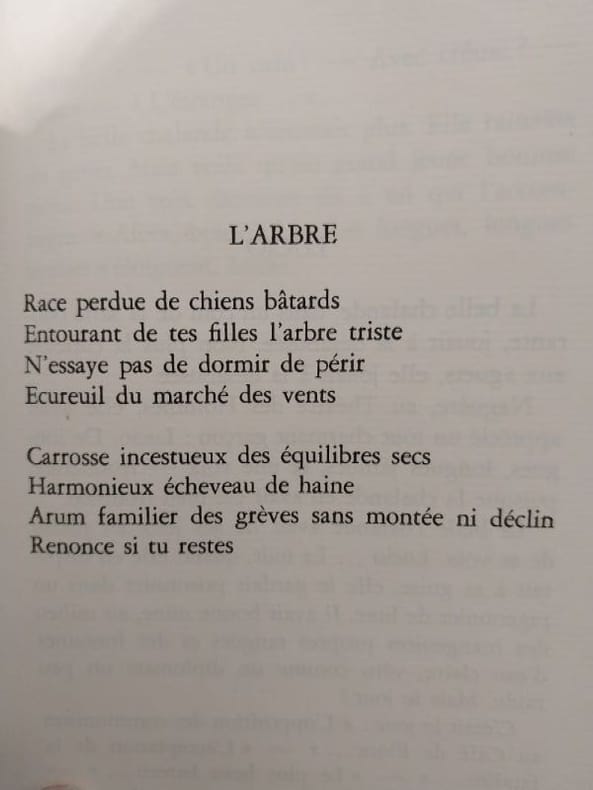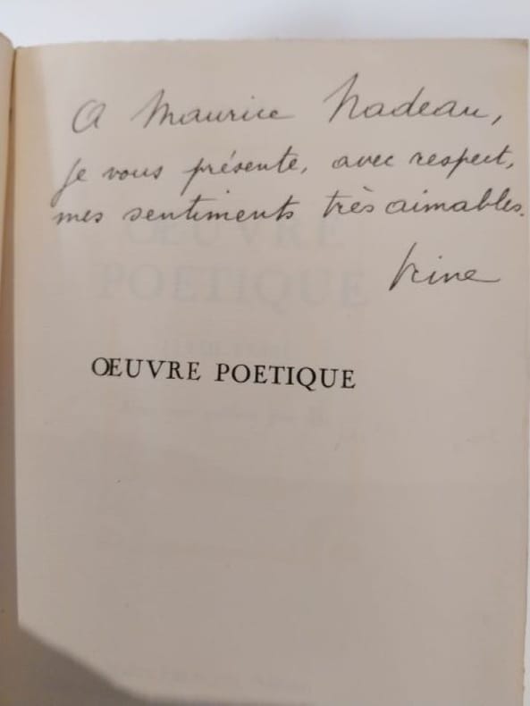 Saint-Generou près Saint Julien de Voventes Maître François éditeur [1949] 1 vol. broché plaquette in-8, brochée, couverture illustrée, 48 pp. Edition originale du premier recueil poétique d'Irène Hamoir (1906-1994) présenté en préface comme "un coup de fouet, un petit coup de fouet". Celle qui "entrelace les mots de son rêve en des poèmes signés Irine" (Patrick Waldberg) fut une figure du surréalisme belge, épouse de Louis Scutenaire et modèle de Magritte en 1936. Tirage limité à 200 exemplaires hors commerce sur vergé, celui-ci avec un envoi autographe signé de l'autrice "à Maurice Nadeau, je vous présente, avec respect, mes sentiments très aimables. Irine". L'exemplaire est resté non coupé, en parfait état. Manque à la Bnf.