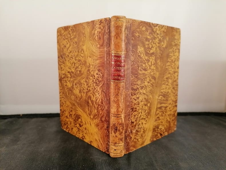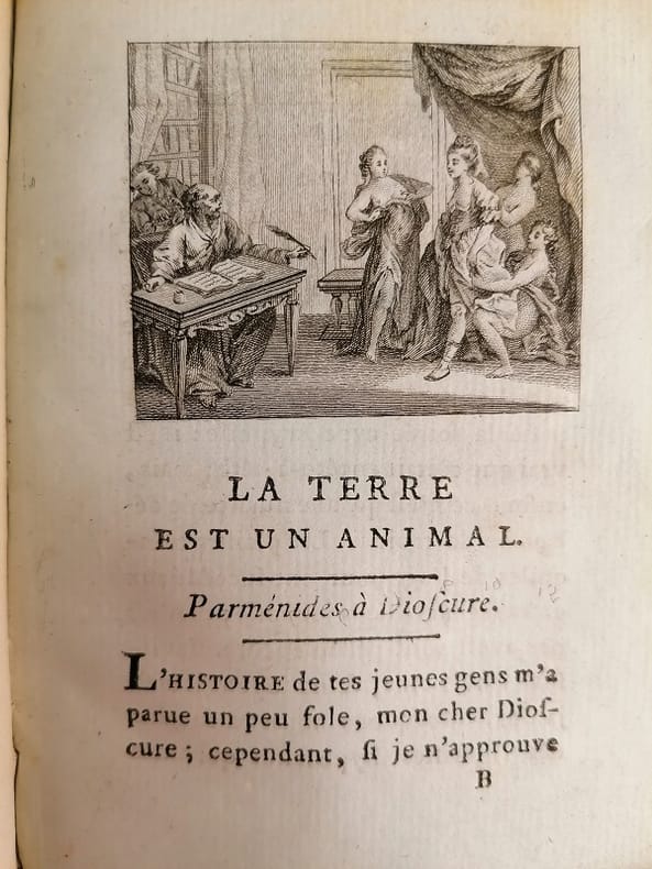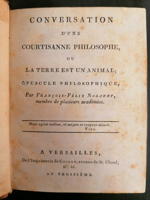 Versailles Imprimerie de Cosson, An III [1795] 1 vol. relié in-16, demi-basane havane, dos lisse orné de filets dorés, pièce de titre rouge, tranches mouchetées, XIX + (1) + 102 + (2) pp., joli bandeau gravé. Edition originale imprimée sur papier bleuté, présentée avec sa nouvelle page de titre, de ce curieux opuscule philosophique considérant la Terre comme un gigantesque organisme. La préface de Gay et Doucé pour leur réimpression de 1880 précise : "Le volume ne semble pas avoir eu d'abord un grand succès, car un nombre d'exemplaires invendus reçurent le nouveau titre "Conversation d'une courtisanne [sic] philosophe, ou La Terre est un animal". Toutefois, depuis ce moment, la thèse risquée de Nogaret étant entrée dans le domaines de possibilités, son livre fut si bien recherché qu'il est devenu presque impossible de se le procurer". A été relié à la fin un feuillet manuscrit sur papier réglé : "Mot de Coclès : conte" de Félix Nogaret. Quérard VI, 439. P.L. Jacob, Catalogue de curiosités bibliographiques, 334. Ex-libris contrecollé : Bibliothèque Mirault. Dos un peu frotté, rousseurs à la page de titre. Sinon exemplaire en bonne condition. Manque à la BNF. Rare.