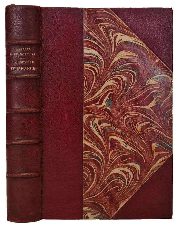 Paris Calmann-Lévy [1903] 1 vol. relié in-12, demi-chagrin rouge à coins, dos à nerfs, tête dorée, couvertures conservées, non rogné, 325 pp. Édition originale du premier roman de la comtesse de Noailles, portrait d’une jeune aristocrate qui, au début du XXe siècle, ne vit que de l’espérance d’être aimée. Elle rêve, cherche, et se laisse emporter par la passion, avant que minuit ne sonne le glas de ses illusions. Roman sentimental, mais aussi roman des contradictions de la condition féminine, La Nouvelle Espérance esquisse la peinture d’une société parisienne que Proust décrira bientôt, et met en scène une héroïne affamée d’amour à qui Anna de Noailles prête sa propre sensibilité, dans une langue subtile qui épouse avec élégance le bonheur et le chaos. Bon exemplaire en reliure d'époque enrichi d'un envoi autographe signé de l'autrice à son amie Madeleine de la Salle, fille de la baronne de Pierrebourg et qui épousera en secondes noces Georges de Lauris.