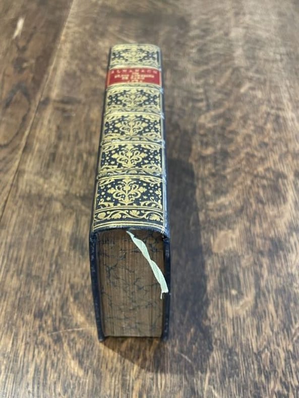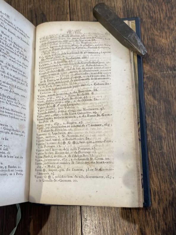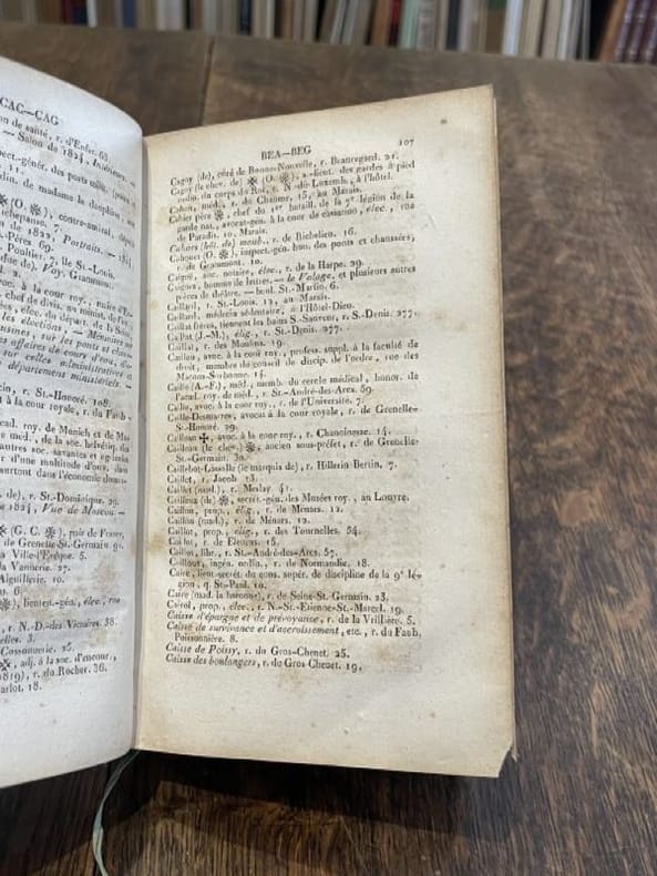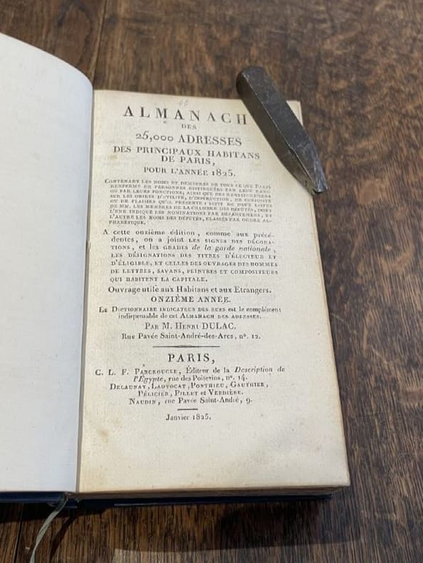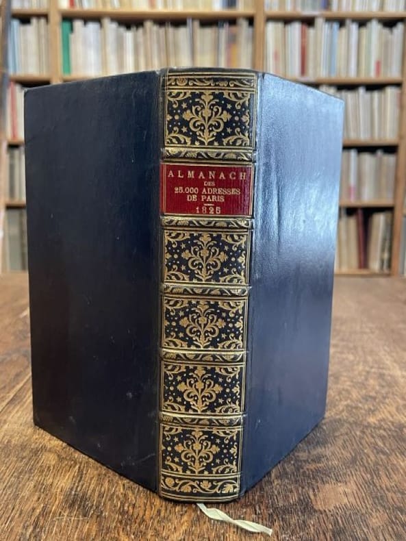 Paris Panckoucke 1825 1 vol. relié fort in-18, plein veau bleu, dos à nerfs plats ornés de guirlandes dorées, caissons richement ornés avec fleuron doré central, pièce de titre de basane rouge, tranches marbrés, XI + 654 pp. + 6 p. (errata et catalogue éditeur), 2 tableaux dépliants (calendrier et liste des députés). Excellent répertoire alphabétique "contenant les noms et demeures de tout ce que Paris renferme de personnes distinguées par leur rang ou par leurs fonctions". Jolie reliure, légèrement postérieure.