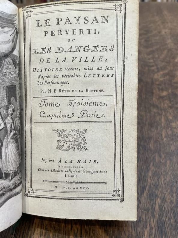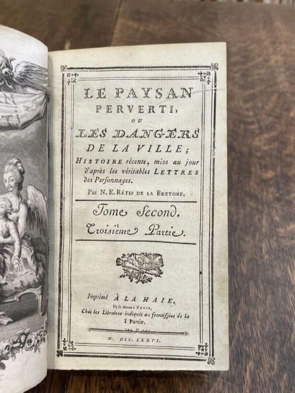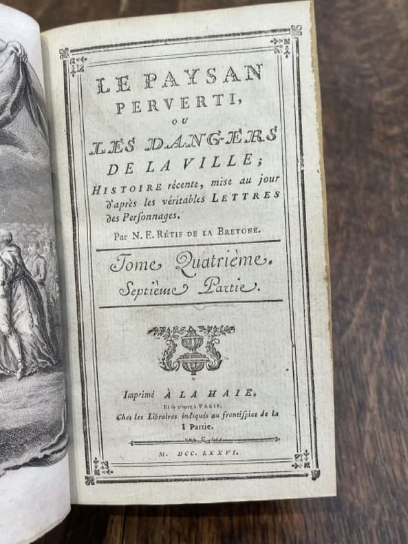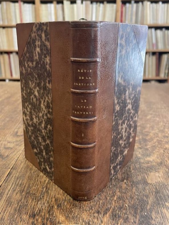 Imprimé à La Haie se trouve à Paris, chés Esprit 1776 [1782] 4 vol. relié 8 parties en 4 vol. in-12, demi-maroquin tabac à coins, dos à fins nerfs (Vailly rel.), VII + 304, 312, 304 et 293 pp. + (1 f.). Quatrième édition, et la première illustrée, donnée par l'auteur lui-même. Exemplaire bien complet des 82 figures par Binet (dont huit frontispices) gravées par Berthet et Le Roy, avec le livret de CLXVIII pp. relié à la fin du quatrième volume : Les Figures du Paysan perverti, recueil de notices pour toutes les gravures. Ce roman épistolaire, d'abord paru en 1775, fit le succès de Restif de la Bretonne qui signe son chef-d'oeuvre. D'inspiration autobiographique, l'ouvrage se distingue par ses descriptions réalistes (notamment l'urbanisation de Paris) et s'impose comme un roman précurseur du genre naturaliste.Bon exemplaire, un peu court de marges (16 x 9,5 cm) mais d'une grande fraîcheur, dans une bonne reliure en maroquin signée de Vailly, artisan qui exerça au Havre durant le dernier quart du XIXe siècle.
