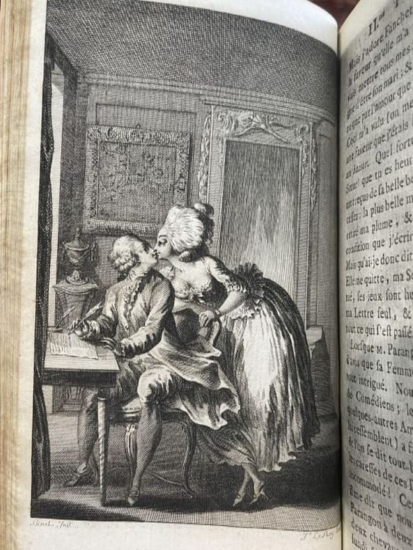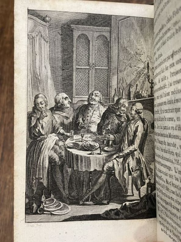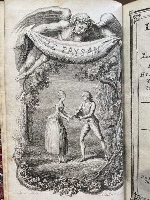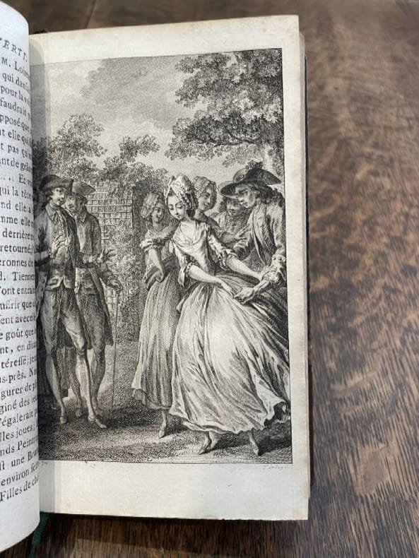 Imprimé à La Haie [La Haye], et se trouve à Paris chés [la d.me Veuve Duchesne, libraire], 1784 8 parties en 4 volumes in-12 de 344, 320, 320-(4) et 344-8-[clxix à ccxliv]-(10) pages. 38 figures hors-texte dont 8 frontispices. Soit un ensemble complet de 16 parties reliées en 8 volumes in-12 (17 x 10,5 cm). Reliure demi-maroquin rouge à petits coins. Reliure pastiche XVIIIe siècle (exécutée dans la première moitié du XXe siècle). Tête dorée. Tranches inégales (non rognées après reliure). Particularités de l'exemplaire : Notre exemplaire est bien complet de 120 figures hors-texte. A noter qu'une des figures pour la Paysanne a été reliée par erreur dans un des volumes du Paysan. Par ailleurs notre exemplaire contient 2 états en couleurs (aquarellés anciennement à la main) pour le Paysan ainsi que 4 états supplémentaires (3 pour le Paysan et 2 pour la Paysanne). La figure de l'attentat est ici en 2 états, avant et après la censure (jambes en l'air visibles et non visibles pour le viol de Madame Parangon). Les reliures sont en excellent état et de très bonne facture. Les dos ornés sont à l'imitation des meilleures reliures décorées de la fin du XVIIIe siècle avec petits fers dorés et pièces de titre et tomaison de maroquin citron. Le quatrième et dernier volume de la Paysanne a les premiers feuillets partiellement délavés (mouillures anciennes sans doute au moment même de l'impression des feuillets). Ce défaut a été fixé par un encollage et un lavage professionnel des feuillets concernés. Le reste des volumes est très frais. Le tirage des figures est de très bonne qualité.