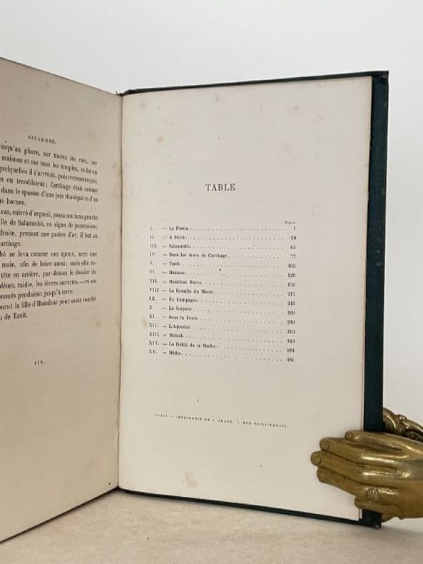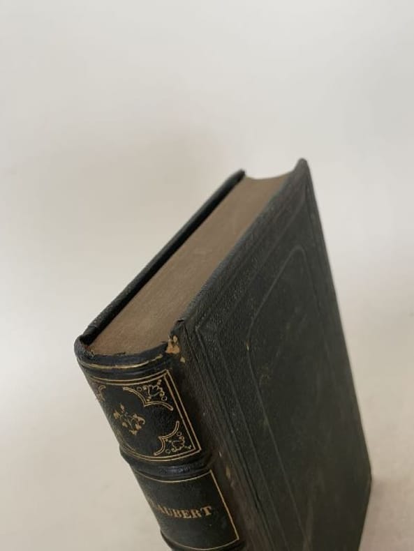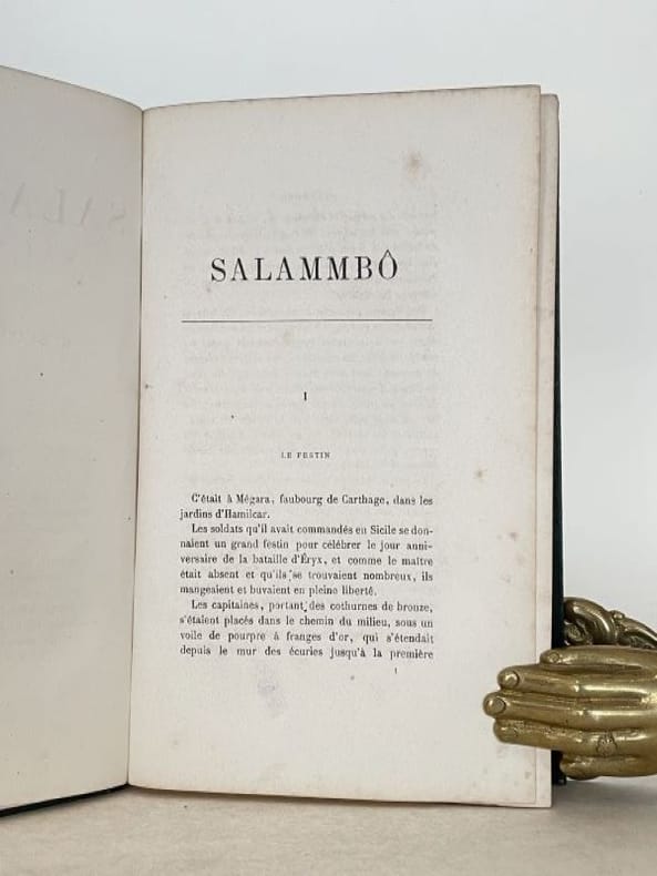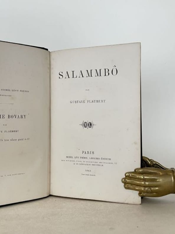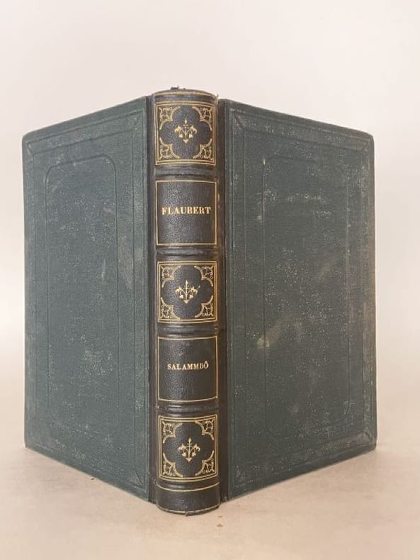 Titre : Salammbô. Œuvres de Gustave Flaubert – Tome premier et Tome second (complet en 2 volumes) Auteur : Gustave Flaubert Éditeur : Alphonse Lemerre, Éditeur Lieu : Paris, 23-33, Passage Choiseul Date : s. d. [vers 1890–1900] Format : 2 volumes in‑12 (env. 18 x 12 cm) Reliure : Demi‑basane brune d’époque, dos à faux-nerfs ornés de filets et fleurons dorés, titres « G. Flaubert — Salammbô I / II » ; plats marbrés. Signet en tissu vert conservé dans le tome II. État du livre : Bon état général. Frottements et petites épidermures aux dos, coins et coiffes émoussés, dos légèrement passés ; plats marbrés avec marques d’usage. Intérieurs propres, papier uniformément jauni avec rares rousseurs éparses, sans annotations ni manques. Reliures solides. Ensemble homogène et complet des deux tomes. Contenu / remarque : Belle édition Lemerre des Œuvres de Flaubert, non illustrée, présentant le célèbre roman historique situé à Carthage après la Première Guerre punique. Page de titre en rouge et noir avec la marque de l’éditeur. Langue : Français