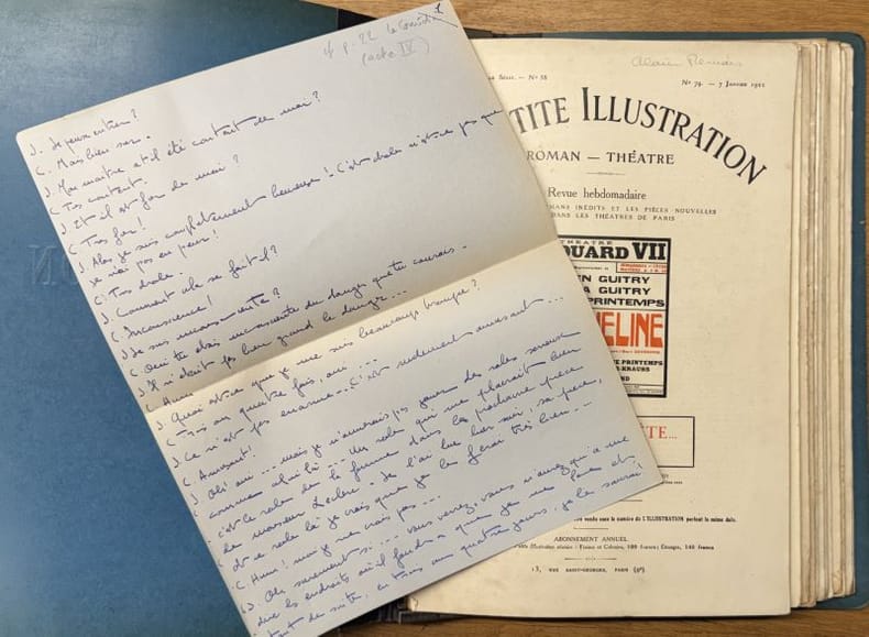 Paris La Petite Illustration 1912-1934 1 vol. broché classeur in-4, demi percaline noire avec titre "La Petite Illustration" au premier plat et une étiquette plastique rouge contrecollée au dos "Guitry". Touchante réunion de douze pièces de Sacha Guitry, dans l'ordre de classement : Jacqueline (7 janvier 1922), La Jalousie (28 juillet 1934), Un beau mariage (6 janvier 1912), Jean III (8 juin 1912), L'Amour masqué (31 mars 1923), Un sujet de roman (10 février 1923), Deburau (27 novembre 1926), Mozart (26 juin 1926), Mariette (18 mai 1929), François Hals ou "L'Admiration" (22 août 1931), Le Comédien (5 mars 1921), Un miracle (17 mars 1928). Deux des fascicules portent l'ex-libris manuscrit à la mine de plomb d'Alain Resnais (Jacqueline et Mariette) et Le Comédien est truffé de 4 feuillets autographes où Resnais a recopié un dialogue du dernier acte. Le cinéaste était un inconditionnel de Guitry. "Je ne peux pas me comparer à Sacha Guitry, bien sûr, mais j’ai vu toutes ses pièces, avec lui sur scène - ce qui est très important ! Je n’ai pas connu la période Yvonne Printemps, mais je l’ai vu avec Jacqueline Delubac et Lana Marconi, avec toujours la même admiration. Le plaisir qu’il donnait sur scène était intense. Comme beaucoup d’autres metteurs en scène, j’ai bondi de joie en découvrant au cinéma Le Roman d'un tricheur. Je serais ravi qu’on voie une influence de Guitry sur moi…" (extrait d'une interview accordée à Julien Dokhan à l'occasion de la sortie de Vous n'avez encore rien vu en 2012). Exemplaire provenant de la bibliothèque d'Alain Resnais.