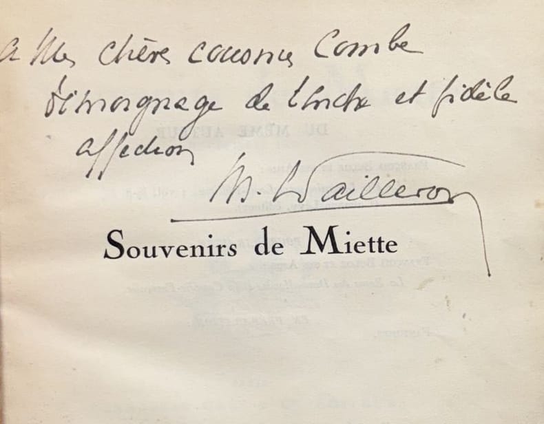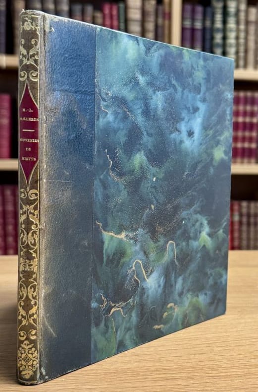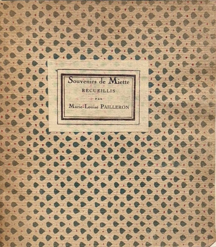 Paris Librairie Crès 1919 1 vol. Relié in-12 carré, demi-veau vert, dos lisse orné de guirlandes dorées avec pièce de titre de maroquin rouge, couvertures conservées, 85 pp. Edition originale avec un envoi autographe signé de l'autrice à ses "chères cousines". Marie-Louise Pailleron (1870-1951) a publié une vingtaine d'études historiques et de romans autour des figures de George Sand, Mme de Staël et autres égéries romantiques. Elle reçoit en 1930 le Grand prix de littérature de l'Académie française pour l'ensemble de son oeuvre. Dans ce recueil fortement marqué par la Grande Guerre et dédié à son fils devenu "un soldat, un homme", elle prend le parti de raconter ses impressions et souvenirs de "l'arrière" du point de vue de sa chienne Miette. Dos légèrement passé, mais jolie reliure décorative.