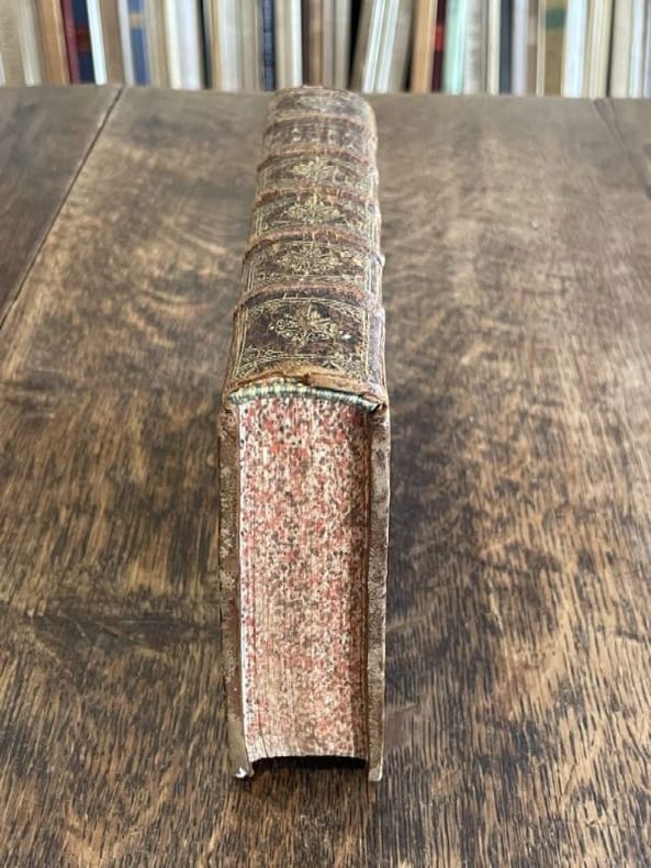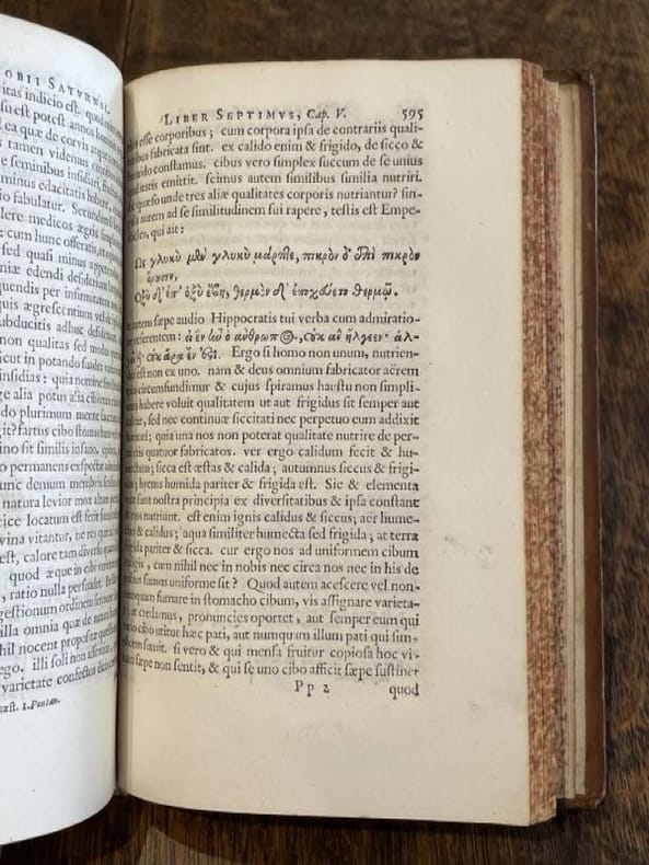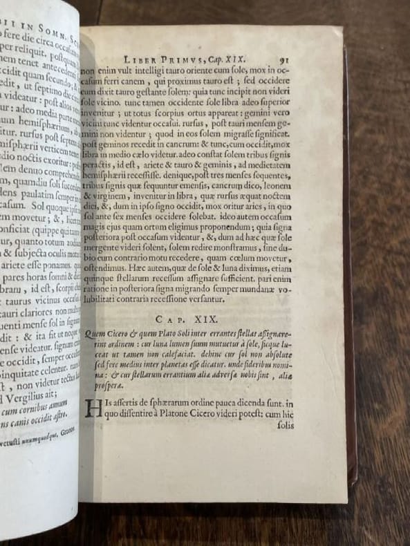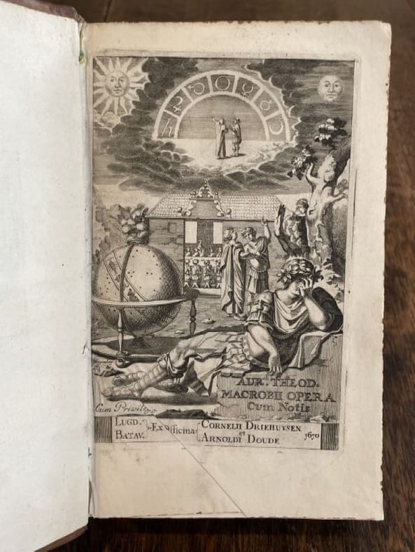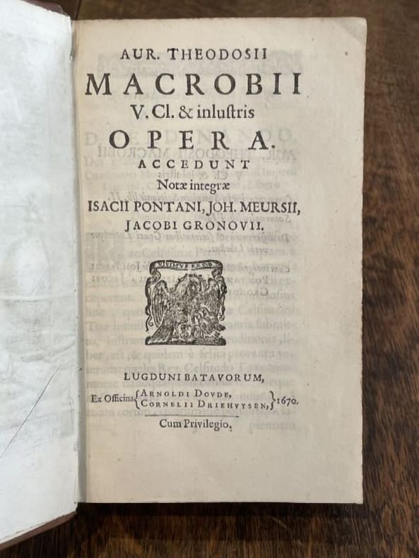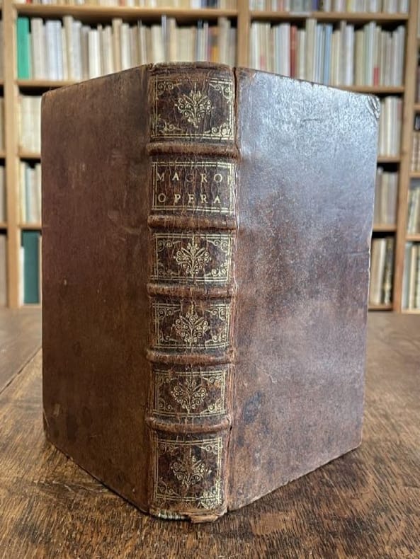 Leyde Arnoldi Doude et Cornelii Driehuysen 1670 1 vol. Relié in-8, basane fauve mouchetée, dos à nerfs, caissons dorés, tranches mouchetées, 16 ff. n. ch. + 704 pp. + 34 ff. n. ch. Edition rare qui réunit les deux principaux traités de l'auteur : Le Songe de Scipion et les Saturnales. avec un beau titre gravé, quelques figures in texte et de nombreuses citations en grec. Un coin légèrement émoussé, sinon exemplaire très bien conservé en reliure d'époque.