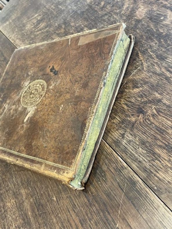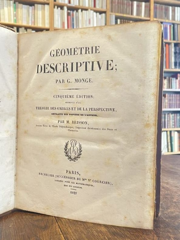 Paris Bachelier 1827 1 vol. relié in-4, veau brun marbré, dos lisse alternant fleurons et guirlandes dorés, guirlande doré en encadrement des plats avec au centre du premier les armes dorées du Collège royal de Bourges, tranches jaunes, XX + 188 pp. + 28 planches dépliantes. Cinquième édition augmentée d'une théorie des ombres et de la perspective. Reliure un peu frottée (deux manque de cuir au premier plat) et quelques rousseurs.