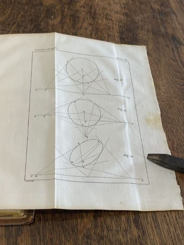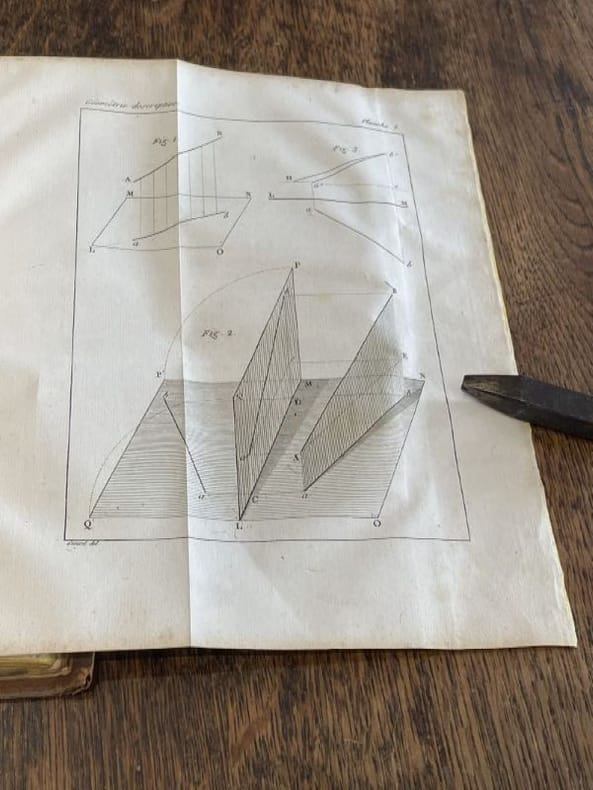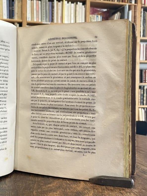 "1822. Paris chez Corby et Guiillaume et Cie 1822 - Relié plein cuir (sceau du Lycée de Versailles sur la couv.) 20 5 cm x 26 cm 320 pages + 67 planches dépliantes in 4° et 5 in folio - Texte de Jean Nicolas Pierre Hachette (1769-1834) - Livre I Géométrie descriptive: 1°/ Définition de la géométrie descriptive et de la Méthode de projection; Préliminaires de la géométrie descriptive; Du point et de la ligne droite; Solutions de divers problèmes relatifs à la ligne droite et au plan. 2°/ Des tangentes aux courbes et des plans tangens aux surfaces courbes; De la génération des surfaces et de leur définition; Exemples de plans tangens aux surfaces. 3°/ Des intersections de surfaces courbes par des plans; Des surfaces développables coupées par un plan; Des surfaces de révolution coupées par un plan; Des intersections de surfaces réglées par un plan et des tangentes aux courbes d'intersection. 4°/ Des intersections de surfaces courbes qui se pénètrent; Autres exemples d'intersection de surfaces; De quelques surfaces du second degré dont la ligne d'intersection est une courbe plane du même degré; Du choix de plans de projections définition et usage de divers modes de projections. Livre II: Application de la géométrie descriptive: 1°/ Des lieux géométriques et de leur usage pour résoudre diverses question; 2°/ Ombres et perspectives; 3°/ Du tracé de la perspective linéaire; Exemples de perspective linéaire par la méthode des points de concours; Des anamorphoses; De la projection perspective dite projection stéréographique. Notes - Appendice - Reliure nécessitant une importante restauration et quelques habituelles rousseurs sinon bon état"