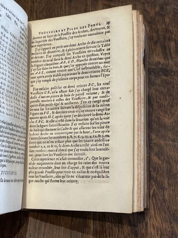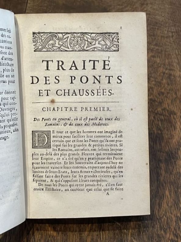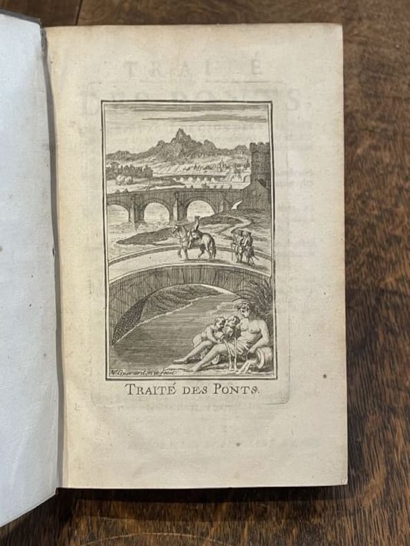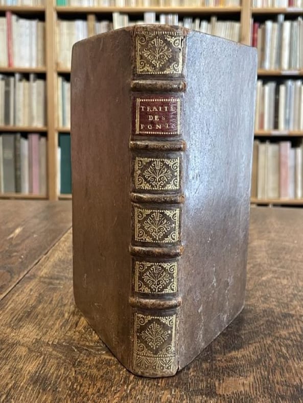 Paris chez André Cailleau 1716 1 vol. relié in-8, plein veau brun, dos à nerfs, caissons ornés aux petits fers dorés avec fleuron central, pièce de titre de cuir rouge, frise dorée sur les coupes, tranches mouchetées rouges, (8) + 215 + (6) pp., frontispice et 26 planches gravées dépliantes. Rare édition originale du premier traité consacré exclusivement à la construction des ponts, réimprimé à de nombreuses reprises. Relié à la suite du même : Dissertation sur l'épaisseur des culées de ponts, sur la largeur des piles, sur la portée des voussoirs... (Paris, André Cailleau, 1716, (2) + 68 pp., frontispice et quatre planches sur un feuillet dépliant). Édition originale. Bel ensemble en reliure de l'époque à peine frottée.
