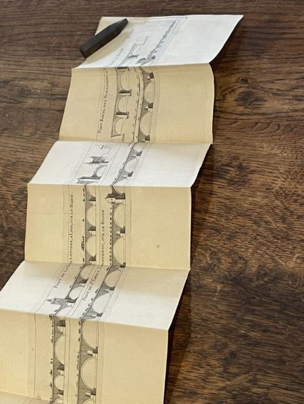 Matériaux dont on les construits, de leurs Fondations, des Echafaudages, des Cintres, des Machines,& des Bâtardeaux à leurs usages. De la différence de toutes sortes de Ponts, soit Dormans ou fixes; soit Mouvans et Flotans, Volans, Tournans, à Coulisses, Pont-Levis à Flèche, & à Bascule, &c. Avec l'explication de tous les Termes.... 3e édition augmentée d'une Dissertation sur les Culées, Pilles, Voussoirs, & Poussées des Ponts, avec plusieurs Devis & Règlemens faits à ce sujet. Paris. Duchesne. 1755. A la suite: Dissertation. Paris. André Cailleau. 1727. 2 parties en 1 volume in-8 (121 x 190mm) plein vélin rigide à dos lisse, muet, joli frontispice gravé par Lucas, 4ff., 334 pages et 26 planches repliées hors texte puis pages 335 à 416 et 4 planches repliées pour la 2e partie. Les pages 385 à 400 ont été déplacées en fin de volume sans perte de texte. Petit travail de vers affectant la marge inférieure de quelques planches, 1 cahier un peu détaché, menus défauts plutôt bon exemplaire de cet ouvrage peu courant.