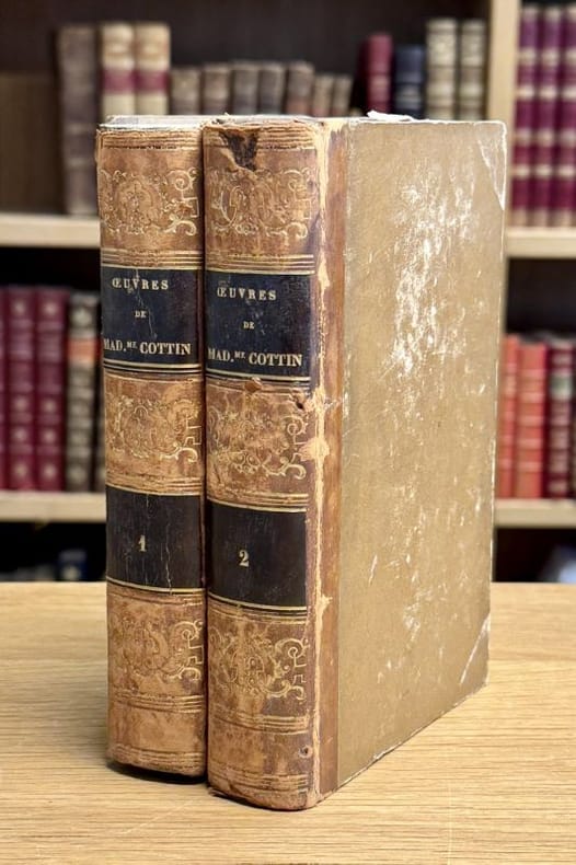 Paris A. Ledentu Fils 1844 2 vol. relié 2 vol. in-12, demi-veau havane, dos lisses ornés de fleurons et filets dorés, pièces de titre et de tomaison de veau noir, 540 et 560 pp. Edition collective comprenant Mathilde, Claire d'Albe, Elizabeth (tome 1) et les deux romans Malvina et Amélie Mansfield (tome 2) qui ont établi la notoriété de Sophie Rastaud dite Mme Cottin (1770-1807). Reliures de l'époque frottées et quelques rousseurs, sinon exemplaire en bon état.