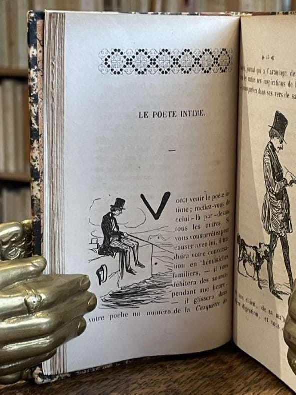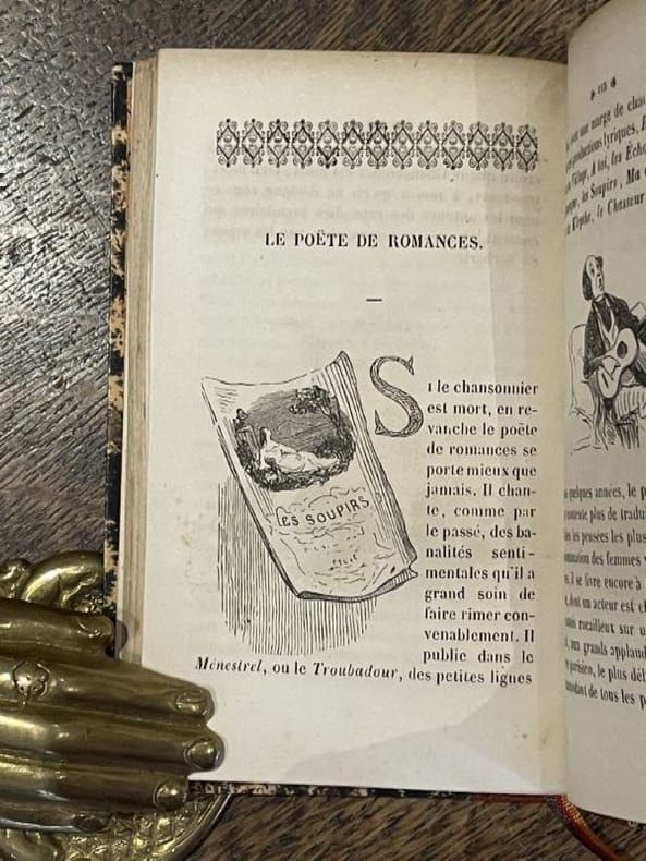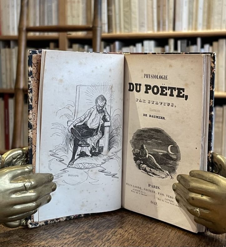 Paris J. Laisné - Aubert et Cie - Lavigne 1841 1 vol. relié in-24, demi-maroquin fauve, dos à faux nerfs soulignés d'une guirlande dorée, caissons ornés de filets dorés avec fleuron étoilé en noir au centre, tête dorée, couvertures conservées, 124 pp., frontispice. Édition originale anonyme par Edmond Texier, illustrée de 43 vignettes sur bois de Daumier. Dos très légèrement passé, sinon agréable exemplaire, bien relié.