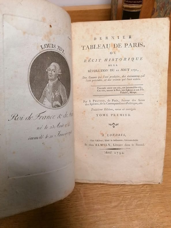Londres chez l'auteur et chez Elmsly 1794 2 vol. relié 2 vol. in-8, demi-basane fauve, dos à nerfs ornés de motifs dorés, pièces de titre et de tomaison rouges et brunes (reliure moderne), (2) + 258 + 119 et (2) + 436 pp., 2 frontispices (portraits de Louis XVI et Louis XVII) et plan dépliant du château des Tuileries. 3e édition revue et corrigée de cette publication contre-révolutionnaire du journaliste et pamphlétaire Jean-Gabriel Peltier (1760-1825), réfugié en Angleterre depuis 1792. Petite auréole en marge du portrait de Louis XVI, sinon très bon exemplaire, dans une reliure pastiche moderne.