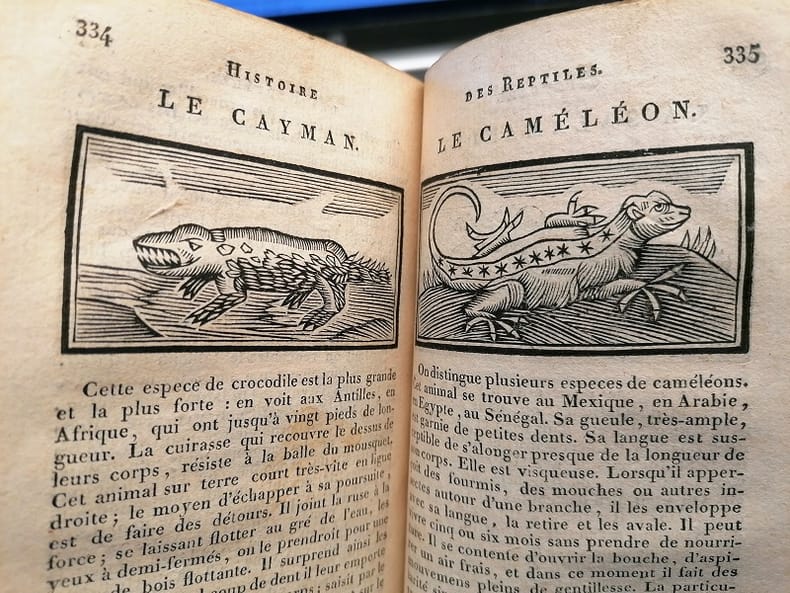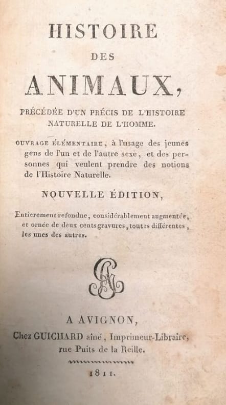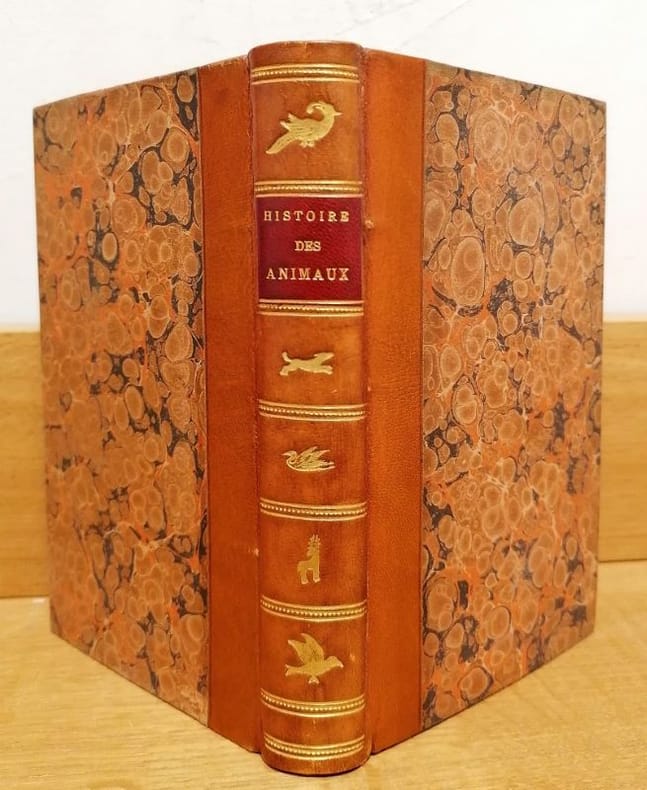 Avignon chez Guichard 1811 1 vol. relié in-12, demi-basane miel, dos lisse orné de 5 fers d'animaux dorés, pièce de titre de chagrin rouge (reliure moderne), faux-titre, titre, p. VII-XII et p. [13]-408, table. "Ouvrage élémentaire, à l'usage des jeunes gens de l'un et de l'autre sexe, et des personnes qui veulent prendre des notions de l'histoire naturelle". Nouvelle édition refondue, augmentée et ornée de 200 gravures dans le texte. Intéressant ouvrage de colportage, peu courant, à l'illustration naïve et souvent fantaisiste. Premiers et derniers feuillets un peu défraîchis, sinon exemplaire en bonne condition, bien conservé dans une reliure du milieu du XXe siècle.