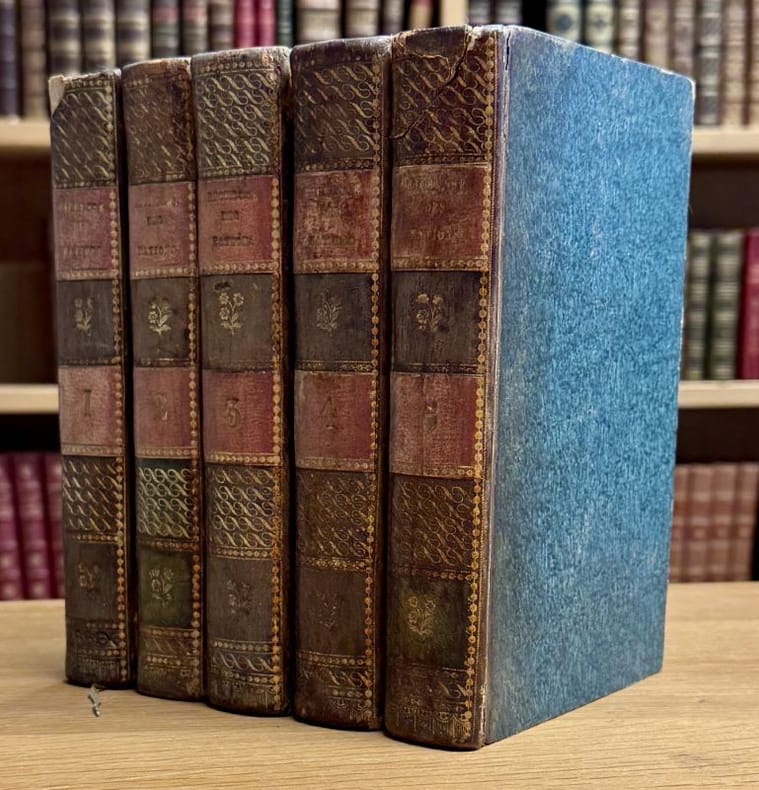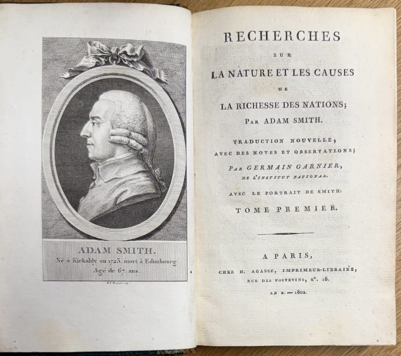 Paris chez H. Agasse 1802 5 vol. relié 5 vol. in-8, demi-veau havane, dos lisses ornés de fleurons et arabesques dorés, pièces de titre et de tomaison vieux-rose, tranches mouchetées, (4) + CXXVII + 368, 489, 564, 556 et 588 pp., joli portrait-frontispice, index. Edition originale de la traduction de Germain Garnier. Cette nouvelle traduction, unanimement saluée, permit au public français d'apprécier et de juger l'oeuvre fondamentale de l'économie politique d'Adam Smith. Dos patinés et un peu frottés, manque de cuir en tête du tome I et grossière restauration en tête du tome V. Exemplaire dans une solide reliure d'époque signée A.G. Roth, l'intérieur très frais et sans rousseurs.
