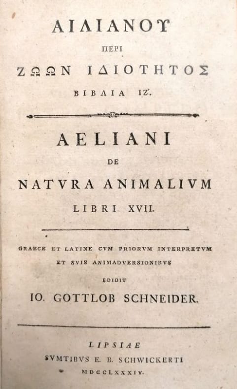 Lipsiae E. B. Schwickert 1784 1 vol. relié 2 parties reliées en 1 fort vol. in-8, demi-basane fauve à coins, dos à nerfs orné de filets dorés, pièce de titre rouge, tranches rouges (reliure postérieure), X + 585 + (21) + 228 + (44) pp, 2 index. Edition du texte grec avec index et notes en latin par Johann Gottlob Schneider (1750-1822). Compilation d'anecdotes sur les caractéristiques et les moeurs de plus de 300 animaux, dont un certain nombre inconnus ou fantaisistes, rédigées par Claude Elien dit Elien le Sophiste (175-235), historien et zoologiste romain de langue grecque. Reliure modeste mais solide du début du XIXe siècle.