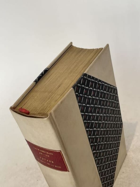 Édition originale du « Voyage au bout de la nuit » de Céline, très élégamment reliée par J.P. Miguet. « À peine a-t-on commencé le livre qu’on est empoigné. Plus que la perfection, la puissance impressionne ». Paris, 1932. Paris, Denoël et Steel, 1932. In-8 de 623 pp. et (1) p., restauration p. 133 d’une petite déchirure dans la marge latérale. Maroquin bleu nuit, plats ornés en marge d’une large composition géométrique de box mosaïqué parallèle aubergine, bordeaux, vieux rouge, vermillon, grège, blanc cassé et blanc, dos lisse orné de même, doublures et gardes de daim vermillon inséré dans des listels de box gris clair, tranches dorées, couvertures et dos conservés, étui. Reliure signée J. P. Miguet et datée 1975. 184 x 113 mm.