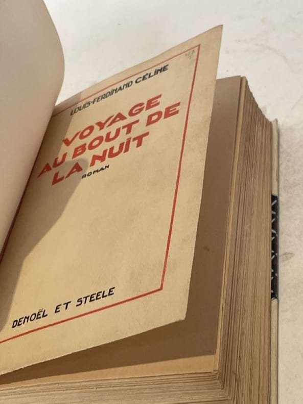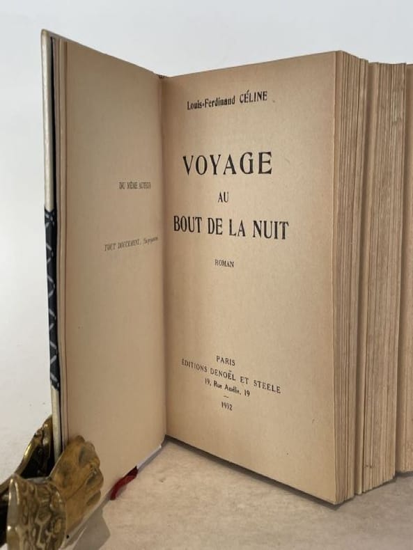 Paris Denoël et Steele 1932 623 pp. Fort in-8. Broché. Très bel état. 1 volume. ÉDITION ORIGINALE du premier roman de l?auteur. Un des 100 exemplaires nume?rote?s sur Alfa, second papier apre?s 10 exemplaires sur verge? d?Arches.Bardamu traverse son époque, de déception en déception : d'abord soldat d'une guerre d'une médiocrité et d'une horreur inégalées puis volontaire dans les colonies africaines, au milieu des cases et des moustiques, avant de gagner l'Amérique au double visage (on pense aux latrines sous le pavé brillant) jusqu'à finir par s'échouer en banlieue parisienne, médecin d'une classe populaire médiocre.Voyage au bout de la nuit est un pavé dans la mare. Céline y fait jaillir un style oral débridé. C'est la naissance d'un nouveau style, c'est même, comme le dit l'auteur lui-même à Gallimard : "du pain pour un siècle entier de littérature. C'est le prix Goncourt 1932 dans un fauteuil pour l'heureux éditeur qui saura retenir cette ?uvre sans pareil, ce moment capital de la nature humaine."Si Céline ne se trompait pas sur les qualités de son ouvrage, Gallimard refusa d'éditer l'ouvrage. C'est finalement Denoël et Steele qui fit paraître le Voyage en 1932, avec le succès que l'on sait, à un détail près : le roman manqua le prix Goncourt de deux voix, l'Académie sélectionnant celui de Guy Mazeline.À défaut de Goncourt, Voyage au bout de la nuit reçut le prix Renaudot et fut imme?diatement un grand succe?s de librairie, retiré à d'innombrables reprises.Un chef-d'?uvre de la littérature française, de toute rareté sur grand papier.