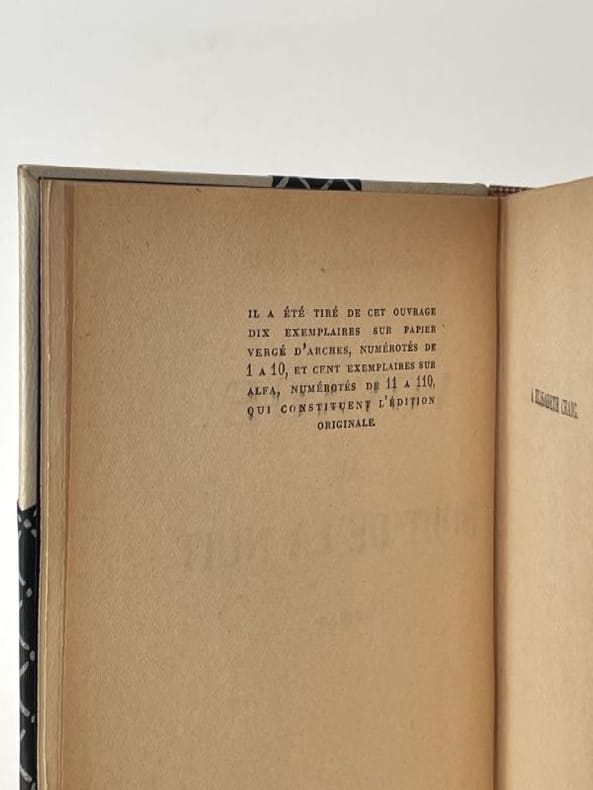 Édition originale tirée à 36 exemplaires ornée en frontispice dun portrait de lauteur, un des 30 exemplaires numérotés sur vélin, seul tirage après 1 japon et 5 hollande. Admirablement imprimé, cet objet bibliophilique rarissime est particulièrement précieux pour sa complémentarité avec lédition originale du Voyage au bout de la nuit. Bel exemplaire présenté sous une chemise en pleine toile beige (comportant une claire mouillure en pieds) qui semble être la chemise-étui de léditeur. Ex-libris encollé au verso du premier plat. * Céline publie pour la première fois son texte le 16 mars 1933 en première page de lhebdomadaire populaire Candide. Quelques jours plus tôt parut dans LIntransigeant un article dÉmile Zavie dans lequel celui-ci fustige le surréaliste témoignage dun érudit garde forestier passant sa bibliothèque au sécateur?: « Il y a des livres de toute sorte, mais, si vous alliez les ouvrir, vous seriez bien étonné. Ils sont tous incomplets?; [] je lis avec des ciseaux [] et je coupe tout ce qui me déplaît. [] Des Loups jai gardé dix pages, un peu moins du Voyage au bout de la nuit. De Corneille, jai gardé tout Polyeucte, et une partie du Cid. Dans mon Racine, je nai presque rien supprimé. De Baudelaire, jai gardé deux cents vers et de Hugo un peu moins. [] de Proust, le dîner chez la duchesse de Guermantes?; le matin de Paris dans La Prisonnière.» Zavie (qui, coïncidence, est lui-même fils dun garde forestier) publie ici sans doute le plus beau et célinien compliment que pouvait recevoir le Voyage, dont Bardamu na à envier à lhomme des bois, ni lintelligence gouailleuse, ni limpertinence nihiliste. Sensuit une polémique très opportune qui a surtout lavantage de permettre à Céline de sortir de la réserve à laquelle il sétait astreint depuis la sortie du livre. Il donne alors libre cours à son esprit ironique et mordant, témoignant dailleurs dune sublime complicité avec ce double sauvage qui tranche dans la littérature comme lui dans la langue et, malicieusement, lhonore dune comparaison avec les plus grands écrivains. Bien plus quune réponse, «lexplication» de Céline sonne comme un manifeste et une puissante réflexion sur son invention dun style qui déconcerte et divise la critique. Robert Denoël rebaptise larticle «postface» et lajoute à la plaquette dextraits de presse élogieuse quil fait éditer en août 1933, pour fêter la cent quatre-vingtième édition. Cependant, la véritable édition séparée de ce texte essentiel ne sera diffusée auprès de quelques rares bibliophiles avertis, quen 1969 aux éditions À la lampe dAladdin de Pierre Aelberts dans sa collection « Le Bahut des Aromates ». Officiellement publié quelques mois après larticle du Candide, à tout petit nombre dexemplaires immédiatement épuisés à lexception du tirage de tête conservé avec les 14 autres titres de la collection dans un meuble en bois précieux, le fameux « bahut » ce petit bijou de bibliophilie fut plus vraisemblablement imprimé, comme toute la collection, peu avant sa miraculeuse apparition sur le marché, à laube des années 1970. Quant aux tirages de tête, il semble que la plupart soit restée dans le mythique bahut ! - Photographies et détails sur www.Edition-Originale.com -