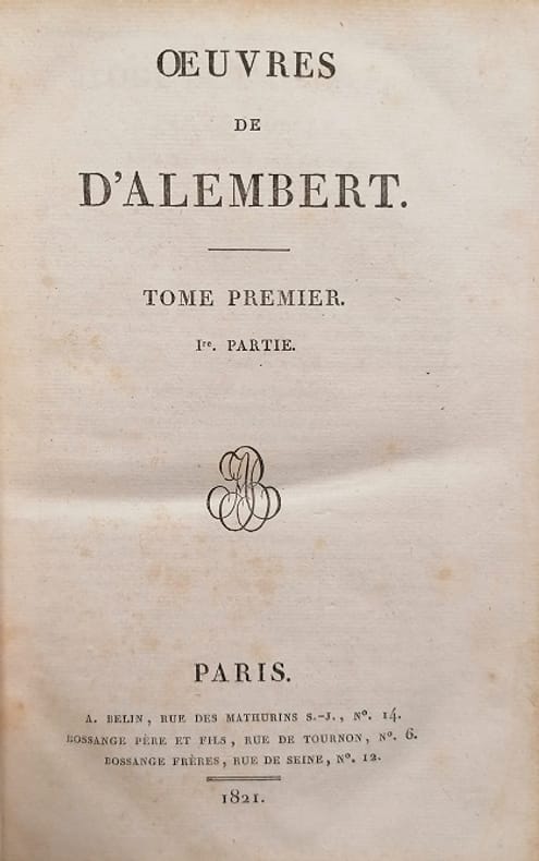 Édition collective en partie originale des travaux philosophiques, historiques, littéraires et scientifiques de d'Alembert comprenant également sa correspondance. L'exemplaire est bien complet du tableau dépliant intitulé Système figuré des connaissances humaines au premier volume. Ex-libris E. Mareuse gravé par Lalauze. Catalogue de la bibliothèque de feu M. Laur. Veydt, n°2301. * Membre du SLAM et de la LILA / ILAB Member. La librairie est ouverte du lundi au vendredi de 14h à 19h. Merci de nous prévenir avant de passer,certains de nos livres étant entreposés dans une réserve.