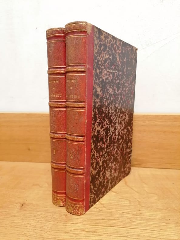 La Haye, Paris chez Claude Bleuet 1774 2 vol. relié 2 vol. in-8, demi-chagrin cerise, dos à nerfs orné de points et filets dorés, XII + 360 et 376 pp., portrait gravé en frontispice. L'édition la plus complète des oeuvres de l'abbé de Chaulieu, publiée par Fouquet, qui précise en préface "nous sommes en droit d'annoncer qu'il y a dans notre édition une cinquantaine de pièces qui ne sont pas dans celle de Saint-Marc". La préface - complète - a été reliée en tête des deux tomes, pp. IX-XII dans le premier et pp. I-VIII dans le second. Coiffes un peu frottées, sinon bon exemplaire, dans une reliure du XIXe siècle.