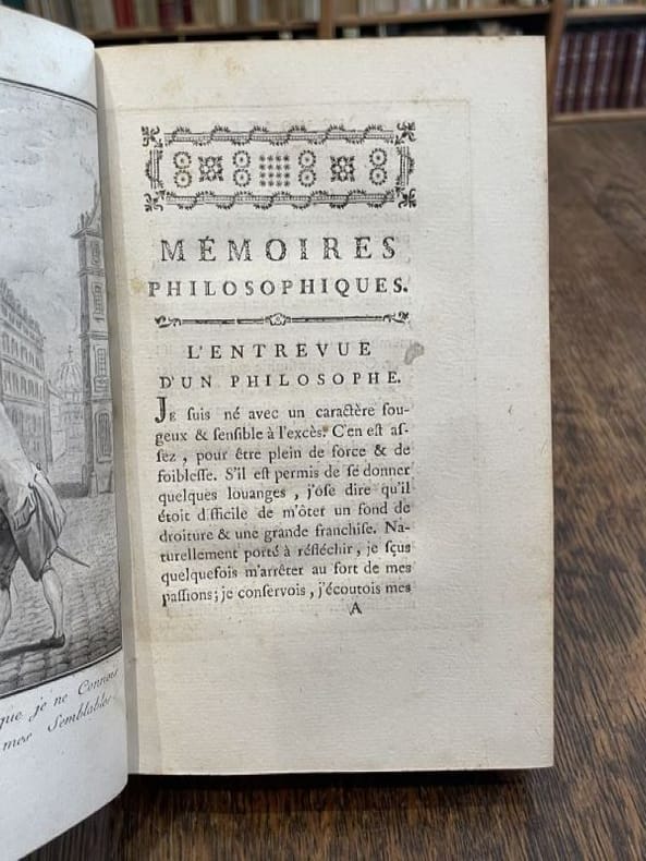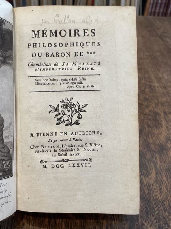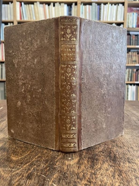 A Vienne en Autriche et se trouve à Paris Berton 1777 1 vol. Relié in-8, demi-veau havane, dos lisse orné de filets et fleurons dorés, pièce de titre de veau fauve, tranches rouges, 304 pp. Edition originale ornée de 4 belles figures hors-texte gravées à l'aquatinte, dont un frontispice. Ces mémoires apocryphes pleins d'ironie forment un pamphlet contre la philosophie matérialiste qui rencontra un large succès, décidant l'auteur à publier l'année suivante une suite. L'ouvrage fut plusieurs fois réédité pendant la Restauration. Légères traces de mouillure, mors un peu usés, sinon plaisant exemplaire en reliure d'époque.