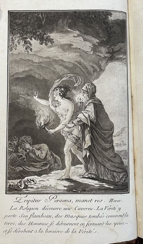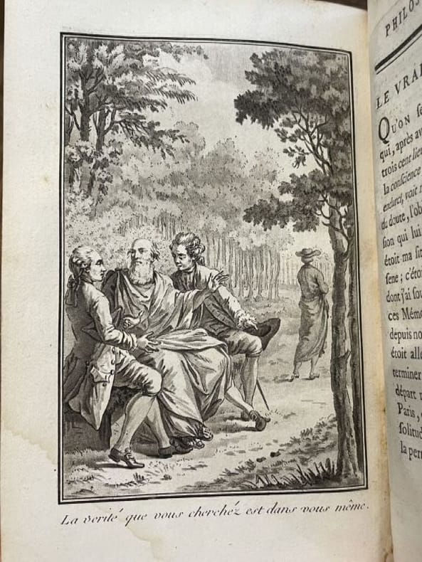 Édition originale de ce pamphlet contre les philosophes. Elle est joliment illustrée d'un frontispice et de 3 figures hors texte, gravés à l'aquatinte, dues à Binet, selon Cohen. Une de ces figures reproduit l'intérieur du fameux café Procope à l'époque. Bel exemplaire en reliure de l’époque. Critique des philosophes et en particulier de la doctrine matérialiste de d'Holbach. Cioranescu, I, 21894.- Cohen, I, 267, REYNAUD col. 103