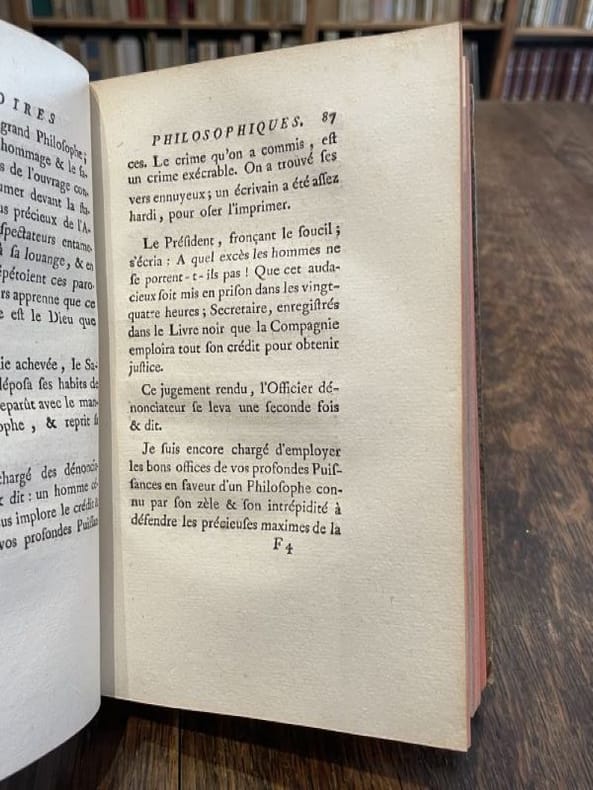i-8 illustré d'un frontispice e de 2 (des 3) planches hors-texte, 1f. (titre), 4p. (Avertissement), 1f. (Tables) et 304p. :: Tome premier seul. :: Edition originale de cet ouvrage contre les doctrines des Philosophes, en particulier d'Holbach. BARBIER 3, 233 ; CIORANESCU 18e, 21894. La gravure manquante est celle du Café Procope (naturellement). Je joins un fac-similé. :: Reliure postérieure, demi-chagrin brun, dos lisse orné de fleurons, au nom de Baron d'Olbac, tranches rouges. :: Bon exemplaire.