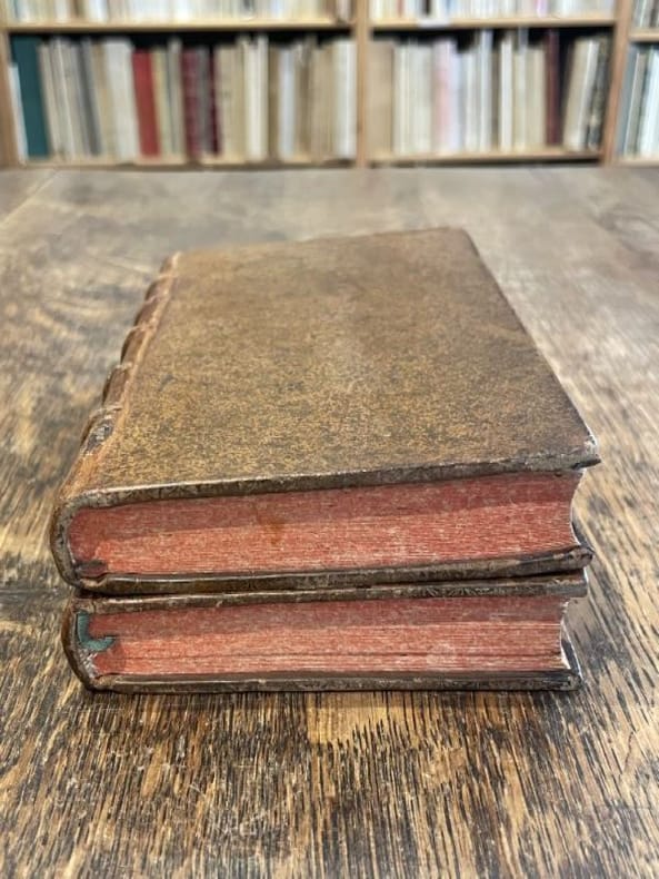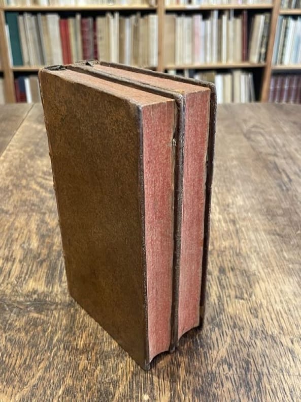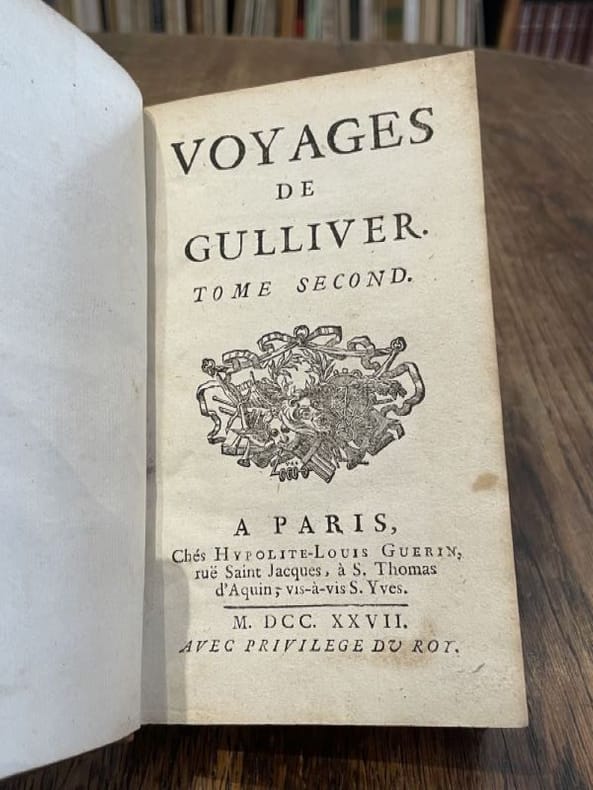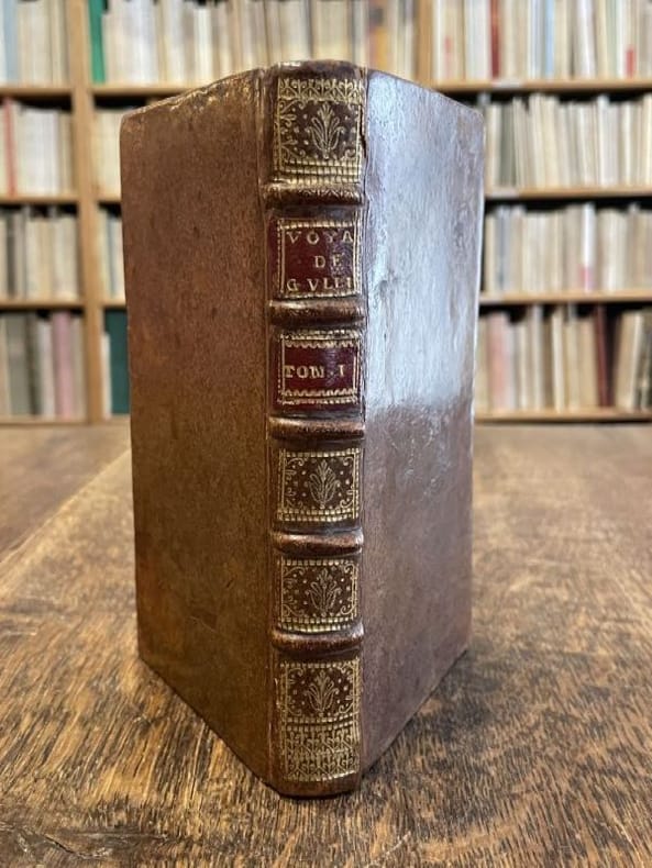 Paris Gabriel Martin et Hypolite-Louis Guérin 1727 2 vol. relié 2 vol. in-12, basane fauve mouchetée, dos à nerfs, pièces de titre de maroquin bordeaux, caissons ornés de fleurons et pointillés dorés, tranches rouges, XLI + (5) + 248 pp. et (8) + 289 + (3) pp. Edition originale française ornée de 4 jolies figures gravées anonymes. Cette traduction par l'abbé Desfontaines parait quelques mois seulement après la première édition anglaise du chef-d'oeuvre de Swift. Le traducteur l'a accompagnée d'une excellente préface sur le succès et la valeur de ce grand voyage imaginaire et philosophique. Minuscule galerie de vers à une dizaine de feuillets du second tome, sinon agréable exemplaire en reliure d'époque.