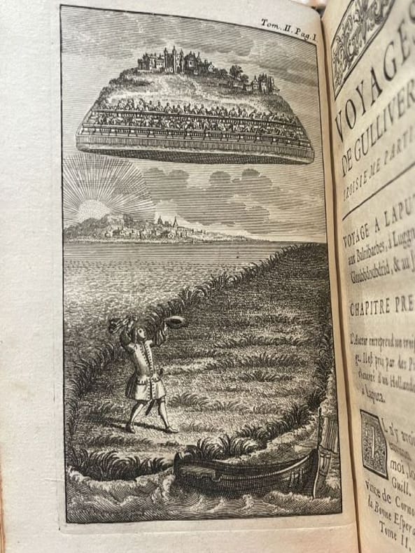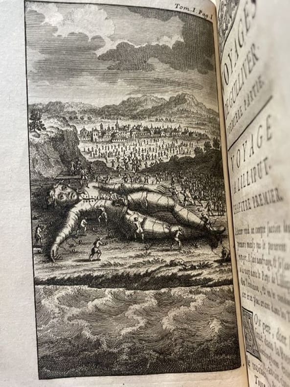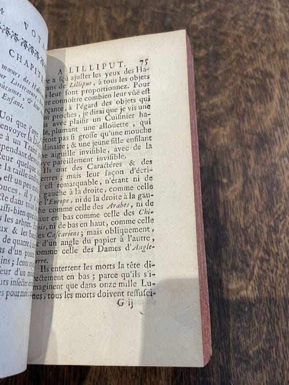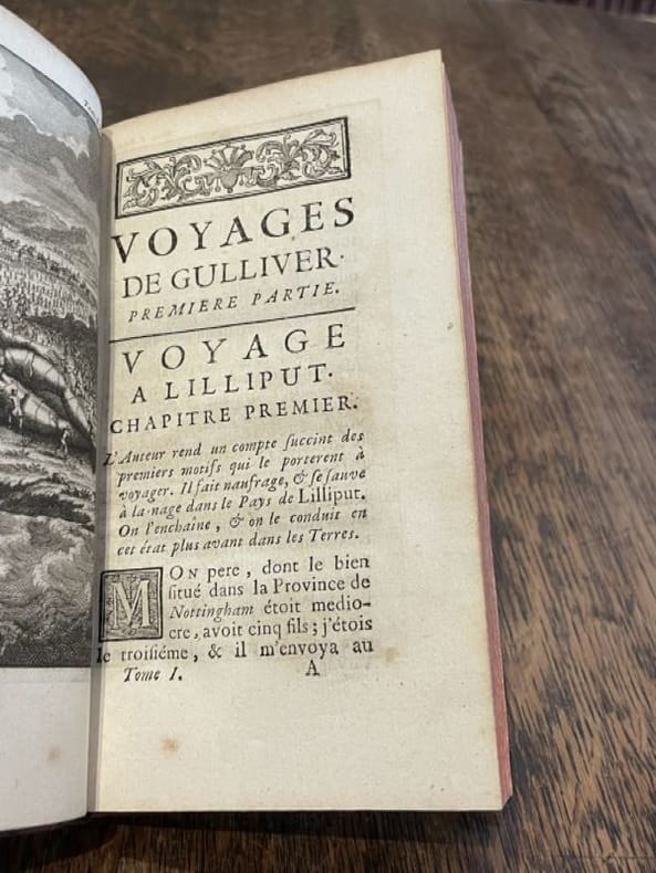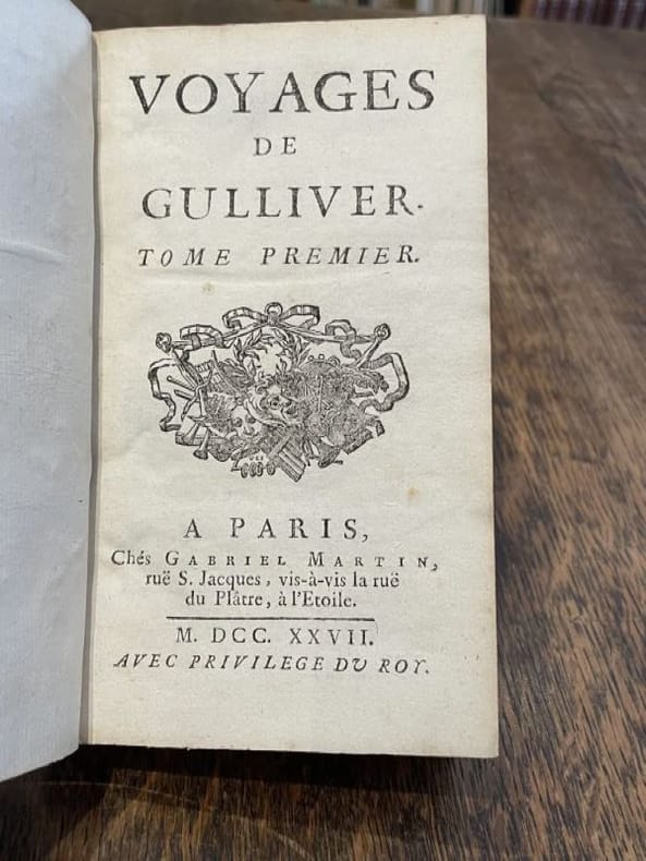 Complet. Etat satisfaisant (reliure un peu frottées avec qq. petites taches d'encre) réunissant au fameux récit de Swift la suite proposée par l'Abbé Desfontaines.