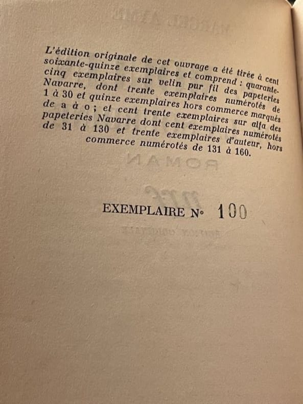 Exemplaire sur vergé des Papeteries de Guyenne numérotés, Illustrations de Roland Topor, 6 vol. in-4 cartonnage éditeur sous étui, tranches sup. argentée, Flammarion, Paris, 1977.Rappel du titre complet : Oeuvres Romanesques (6 Tomes - Complet) Tome 1 : Brûlebois - Aller-retour - La table aux crevés - La rue sans nom - Le vaurien ; Tome 2 : Le Puits aux images - La jument verte - Le nain - Maison basse ; Tome 3 : Le moulin de la Sourdine - Gustallin - Derrière chez Martin - Silhouette du scandale - Le Boeuf clandestin ; Tome 4 : Les Contes du Chat perché - Travelingue - La belle image - Le Passe-muraille ; Tome 5 : La Vouivre - Le chemin des écoliers - Le vin de Paris - Le confort intellectuel ; Tome 6 : Uranus - En arrière - Les tiroirs de l'inconnu - La fabrique - Samson 05