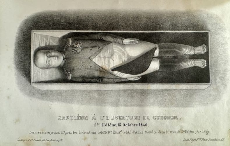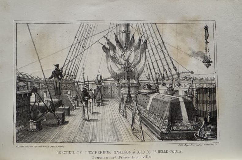 Paris H. L. Delloye 1841 1 vol. relié in-8, demi-veau noir, dos lisse orné d'un décor doré en long, (4) + XVI + 321 pp., 5 lithographies en noir hors-texte dont le frontispice. Edition originale. [Relié à la suite : ] LANGLE (Ferdinand) : Funérailles de l'empereur Napoléon, relation officielle de la translation de ses restes mortels depuis l'Ile Saint-Hélène jusqu'à Paris et description du convoi funèbre (L. Curmer, 1840, 32 pp., couvertures conservées, gravures sur bois dans le texte). Edition originale sans mention. Ex-libris : Georges Delaporte. Mors supérieur fendillé en tête. Sinon exemplaire en bonne condition, en reliure d'époque.
