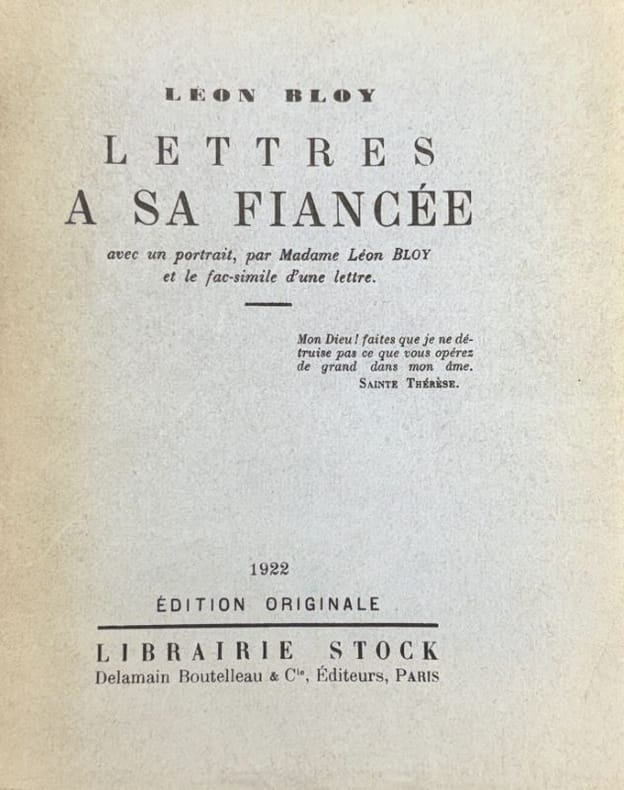 Léon Bloy, Lettres à sa Fiancée. Paris, Librairie Stock, 1923. In-8, front.-142p. Edition originale, mention fictive de septième édition. Publication des lettres à Jeanne Molbech avant son mariage avec Bloy. Plein chagrin brun, dos lisse, couvertures conservées. Papier jauni, couverture avec déchirure réparée au moment de la reliure. Bon exemplaire, rarement bien relié.