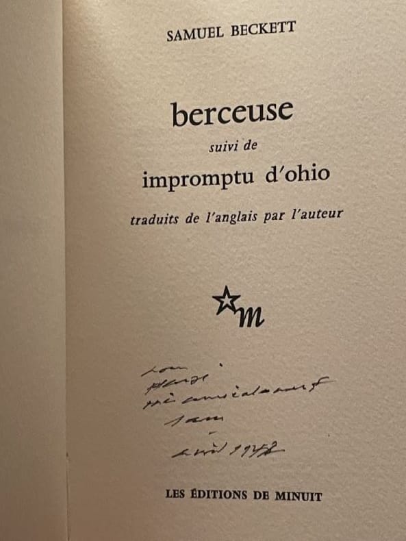 Paris Editions de Minuit 1982 1 vol. broché plaquette in-18, brochée, non coupée, 35 pp. Edition originale française tirée seulement à 99 exemplaires numérotés sur vélin d'Arches, plus quelques exemplaires hors commerce, comme celui-ci justifié "H.C." et enrichi en page de titre d'un envoi autographe signé de l'auteur : "Pour Henri, très amicalement Sam avril 1982". Le destinataire est Henri Causse, directeur commercial des éditions de Minuit. En parfaite condition.