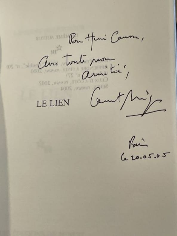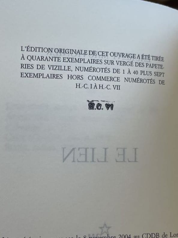 Paris Editions de Minuit 2005 1 vol. Broché in-8, broché, non coupé, 56 pp. Edition originale. Un des 47 exemplaires sur vergé de Vizille (seul grand papier), et parmi ceux-ci l'un 7 hors commerce (numéroté H.C. VI), avec un envoi autographe signé de l'auteur à Henri Causse, directeur commercial des éditions de Minuit. En parfait état.