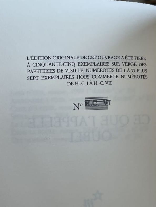 Paris Editions de Minuit 2011 1 vol. Broché in-8, broché, non coupé, 61 pp. Edition originale. Un des 62 exemplaires sur vergé de Vizille (seul grand papier), et parmi ceux-ci l'un 7 hors commerce (numéroté H.C. VI), avec un envoi autographe signé de l'auteur à Henri Causse, directeur commercial des éditions de Minuit. En parfait état.